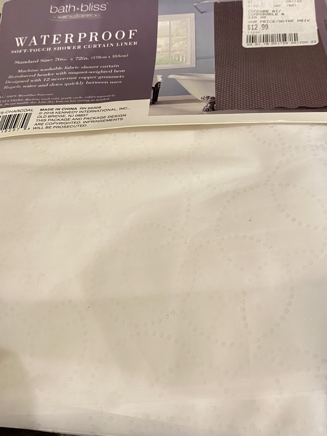This is a brand new Bath Bliss waterproof, soft-touch shower curtain liner.