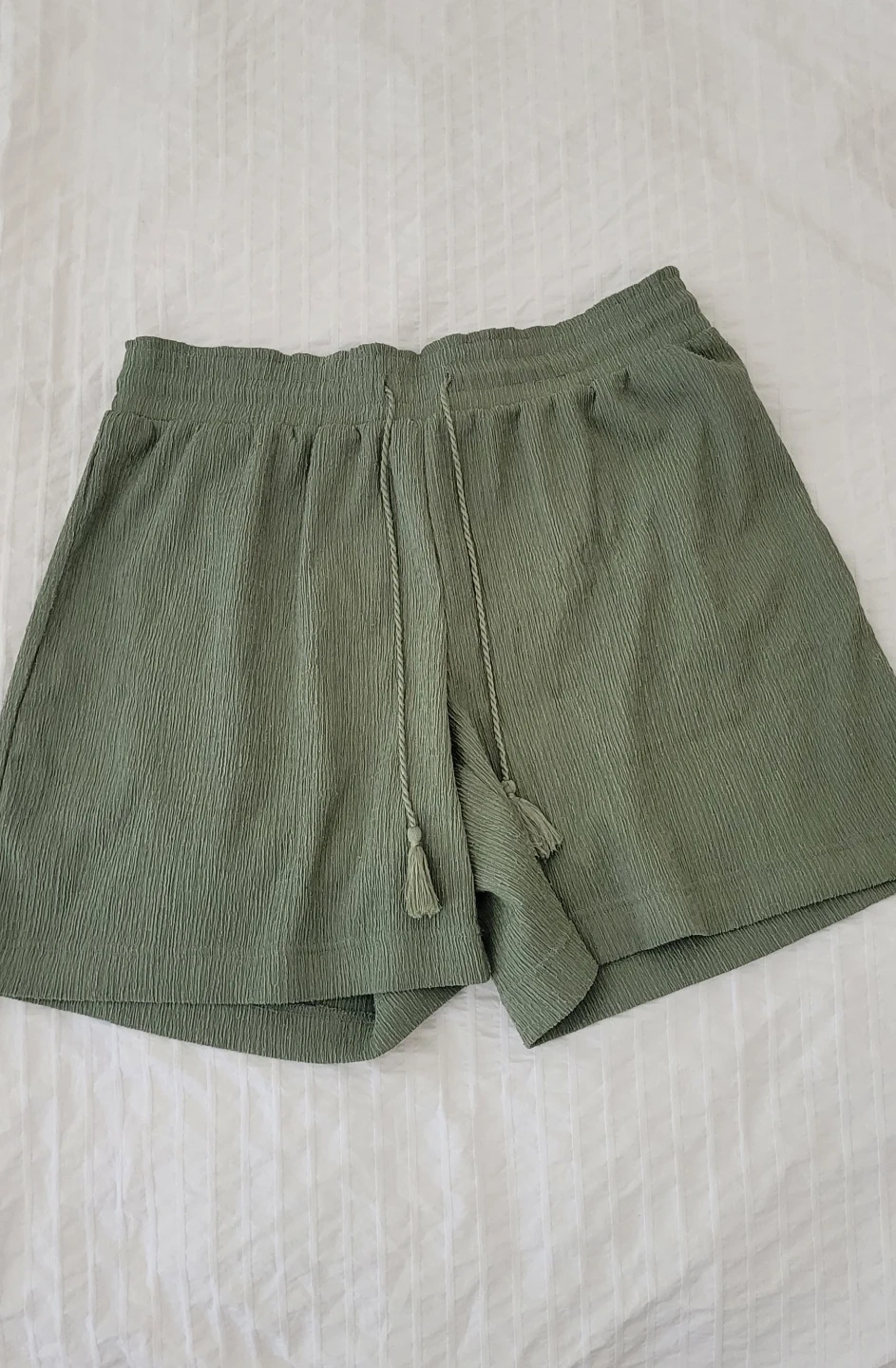 These olive green shorts have a unique textured fabric and an elastic waistband with a decorative drawstring. They're comfy and casual for everyday wear. The fabric is lightweight, perfect for warmer weather.