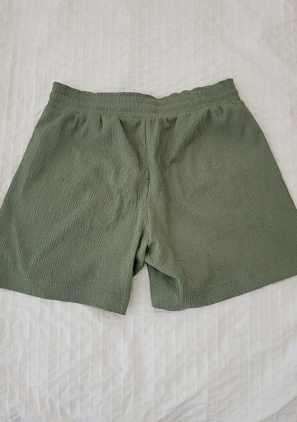 These olive green shorts have a unique textured fabric and an elastic waistband with a decorative drawstring. They're comfy and casual for everyday wear. The fabric is lightweight, perfect for warmer weather.