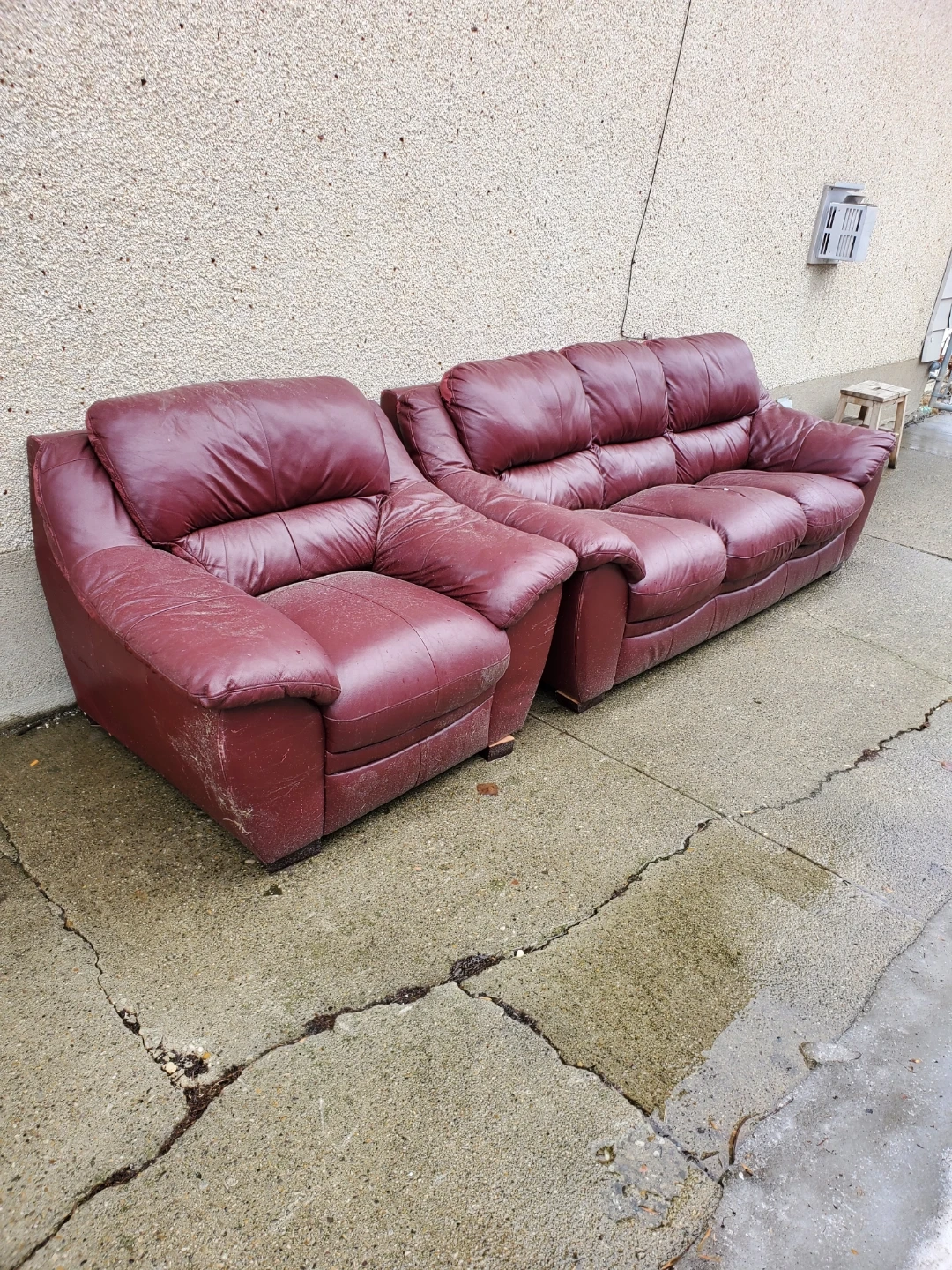 This set includes a three-seater sofa and a matching chair. Both pieces are upholstered in maroon faux leather. They're a bit worn but still functional. They would make for a good basement couch or garage couch.