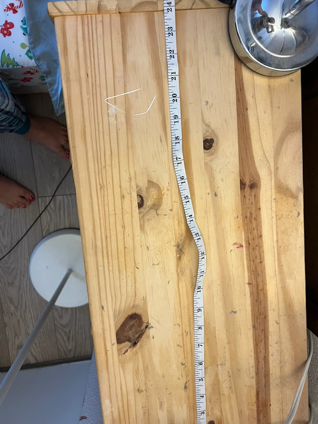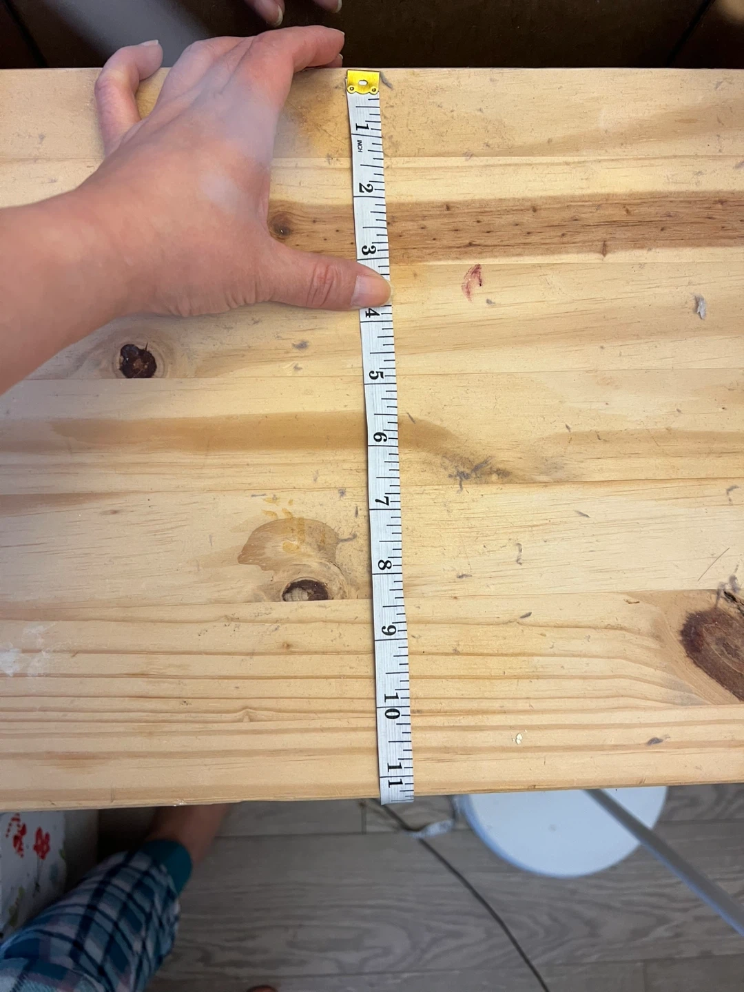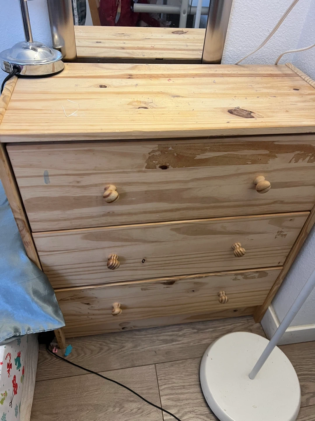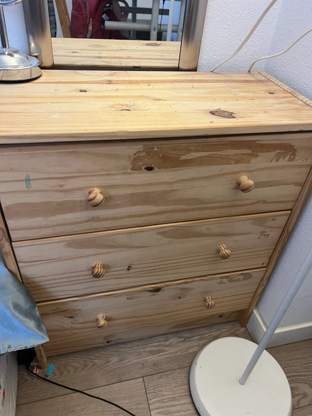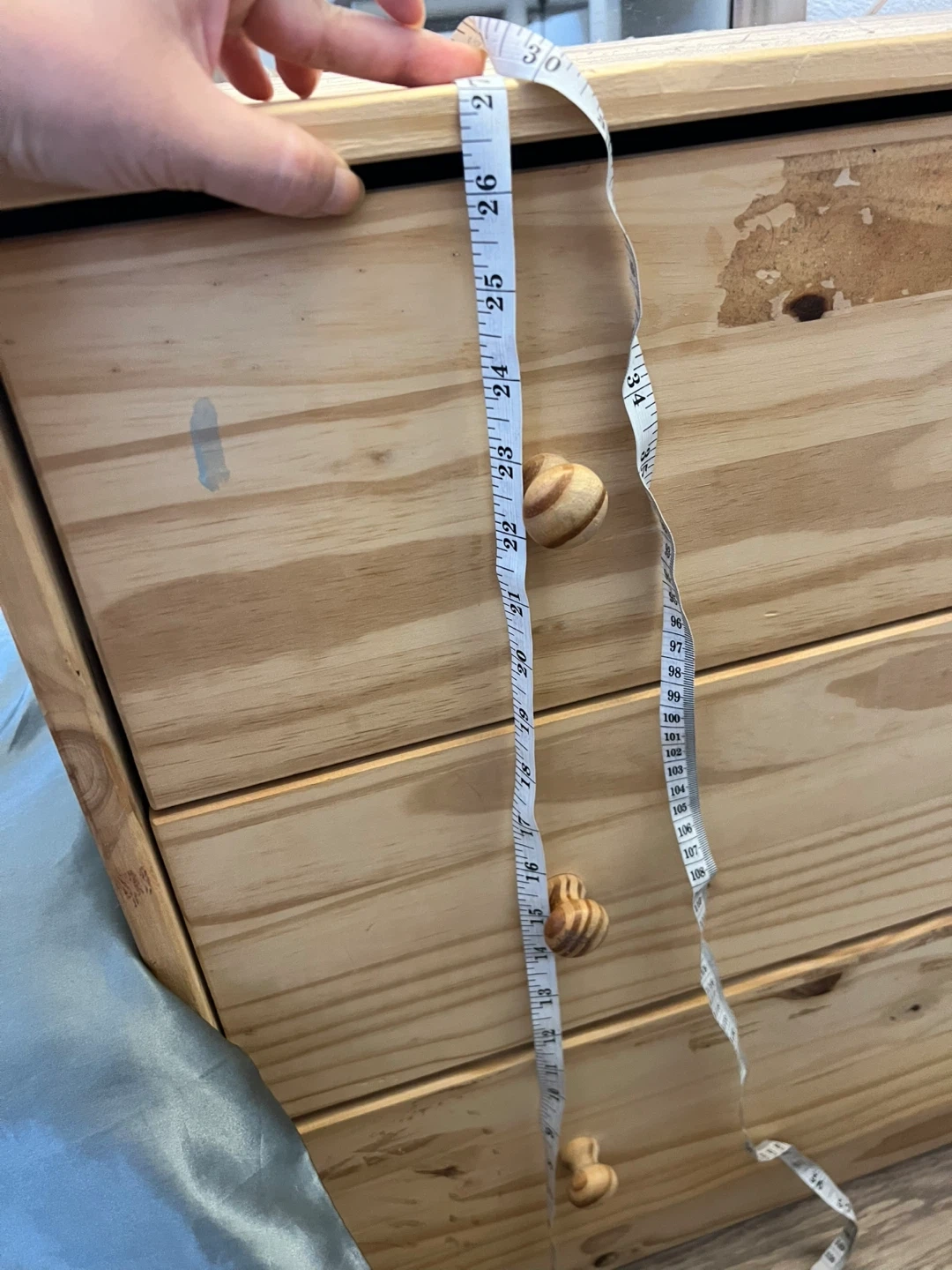 Pine wood 3-drawer dresser. Measures approximately 23 inches tall, 12 inches deep, and 26 inches wide. Features wooden knob handles. Some wear visible on the top drawer.