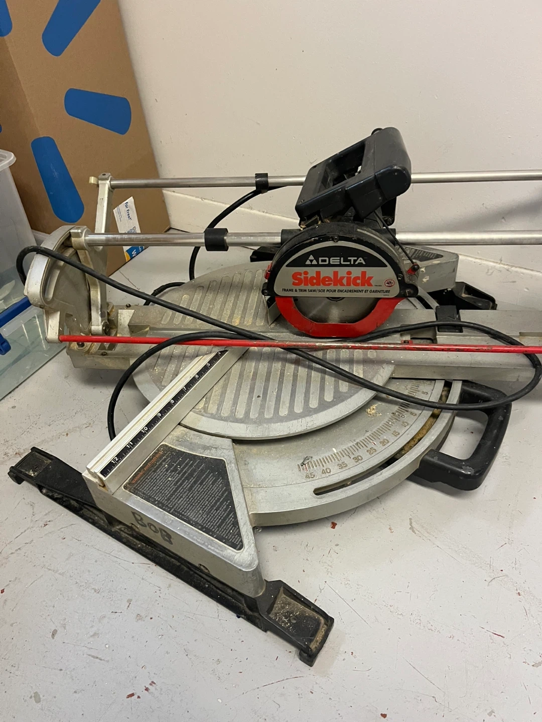 This is a Delta Sidekick frame and trim saw. It features a visible measurement scale for accurate cuts. It's a compound miter saw, suitable for various woodworking projects.