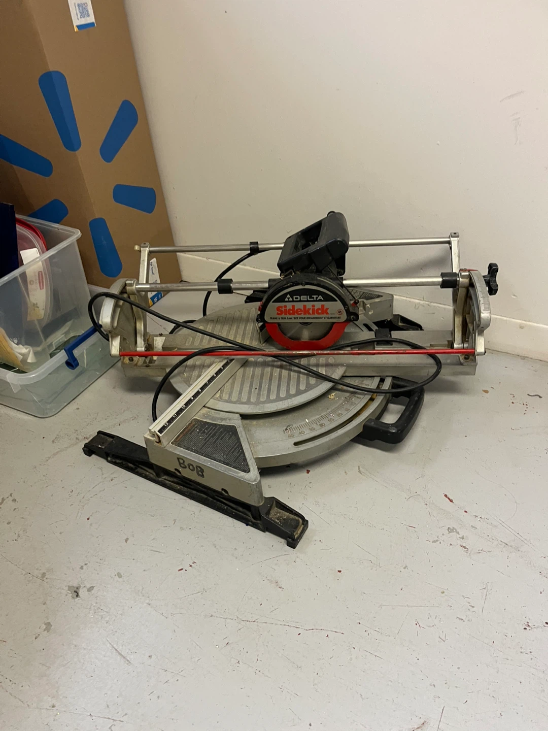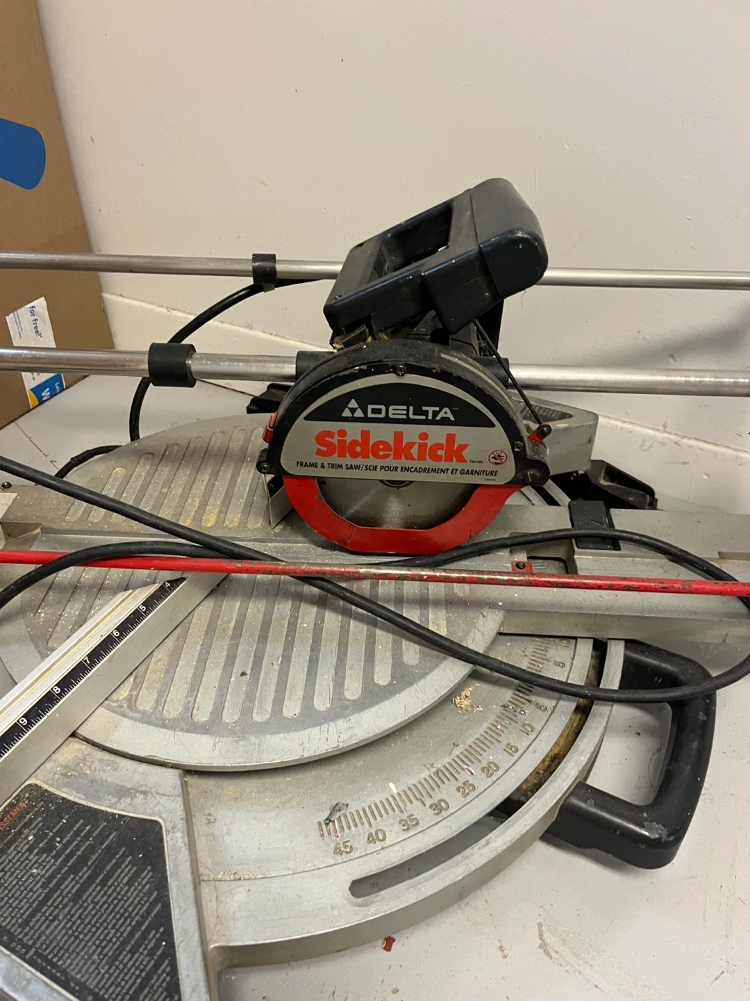 This is a Delta Sidekick frame and trim saw. It features a visible measurement scale for accurate cuts. It's a compound miter saw, suitable for various woodworking projects.