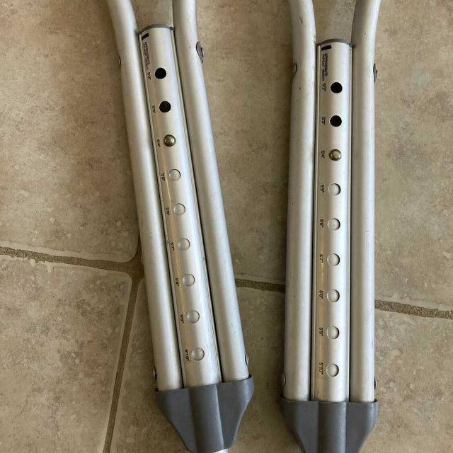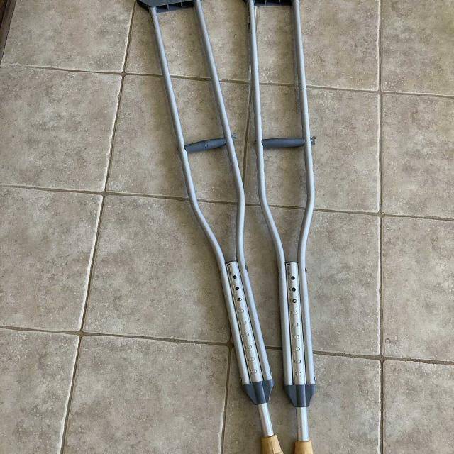 Pair of lightweight aluminum medical crutches in good condition, perfect for injury recovery, post-surgery support, or mobility assistance. These adult-size crutches adjust easily to fit different heights and are durable yet lightweight for everyday use.