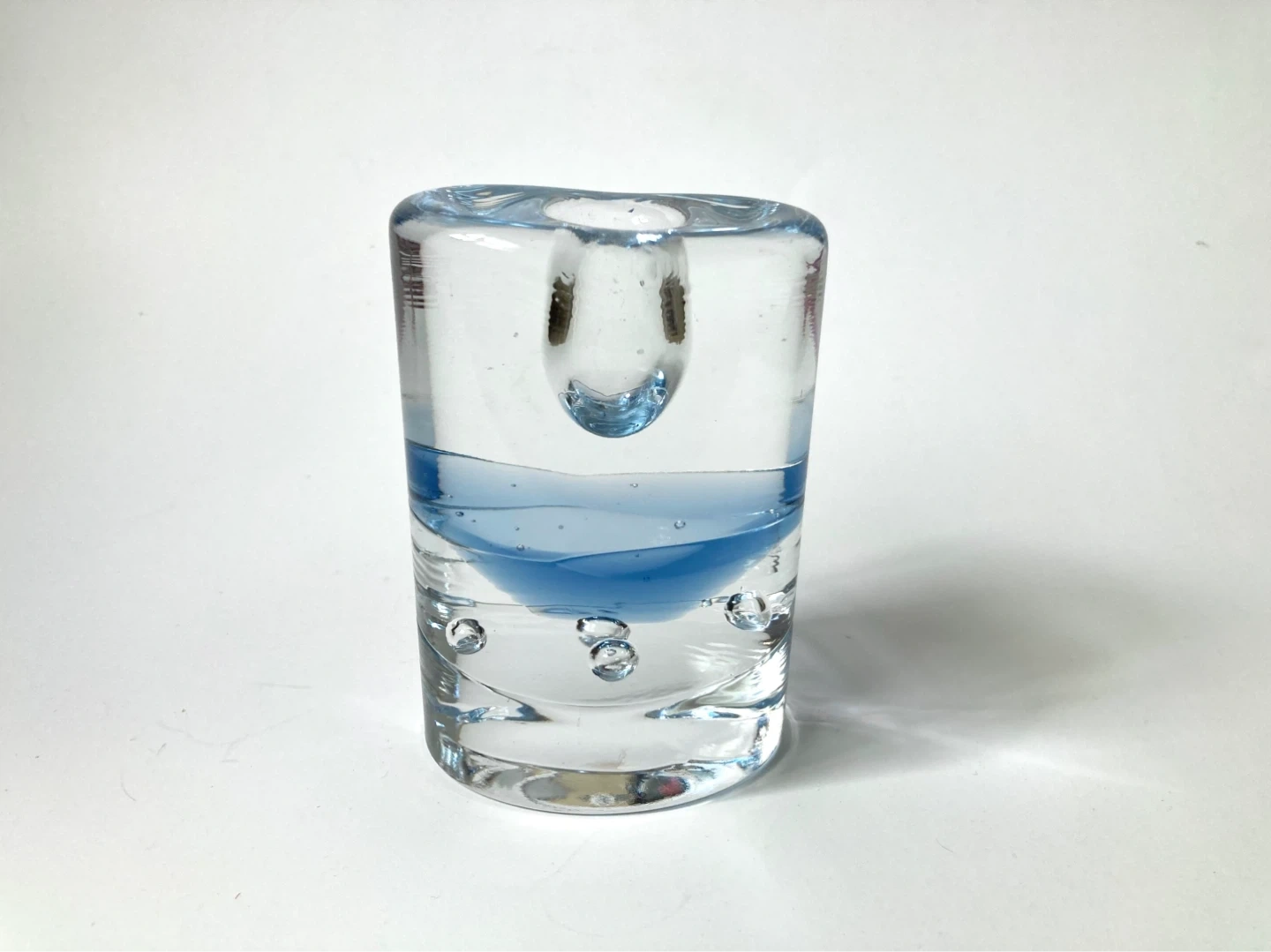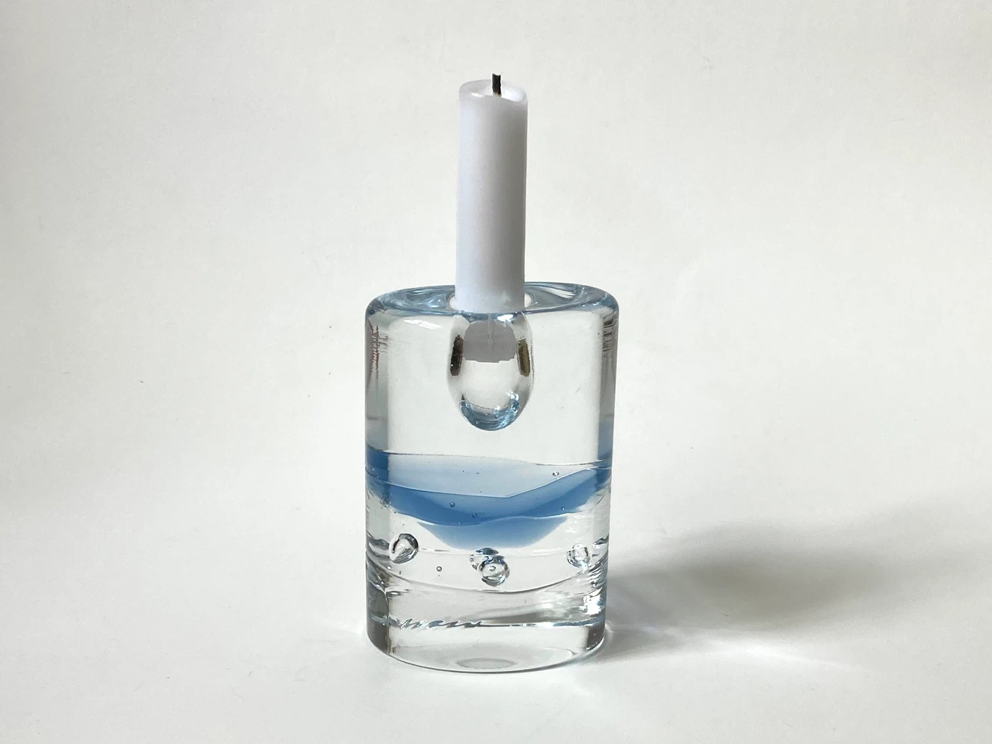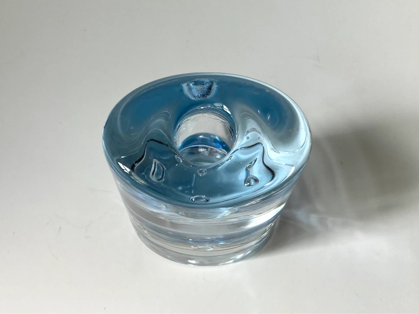 Postmodern Arktia glass candle holder, designed by the renowned Finnish artist Timo Sarpaneva for Iittala. Introduced in 1985 as an evolution of Sarpaneva's earlier Arkipelago series, the Arktia line is characterized by its heavy, clear "ice" glass and a distinctive blue-toned section that symbolizes water trapped under ice.