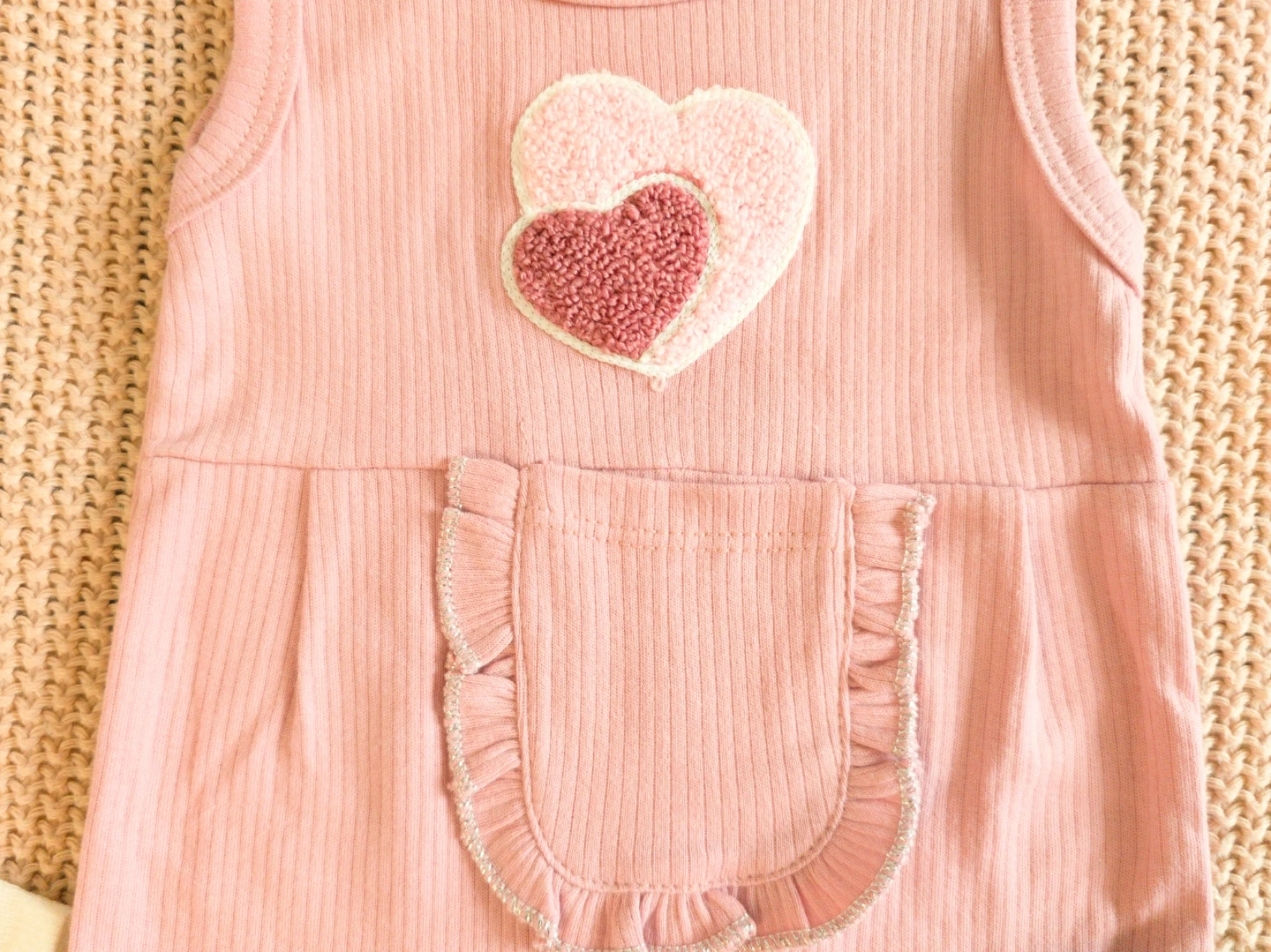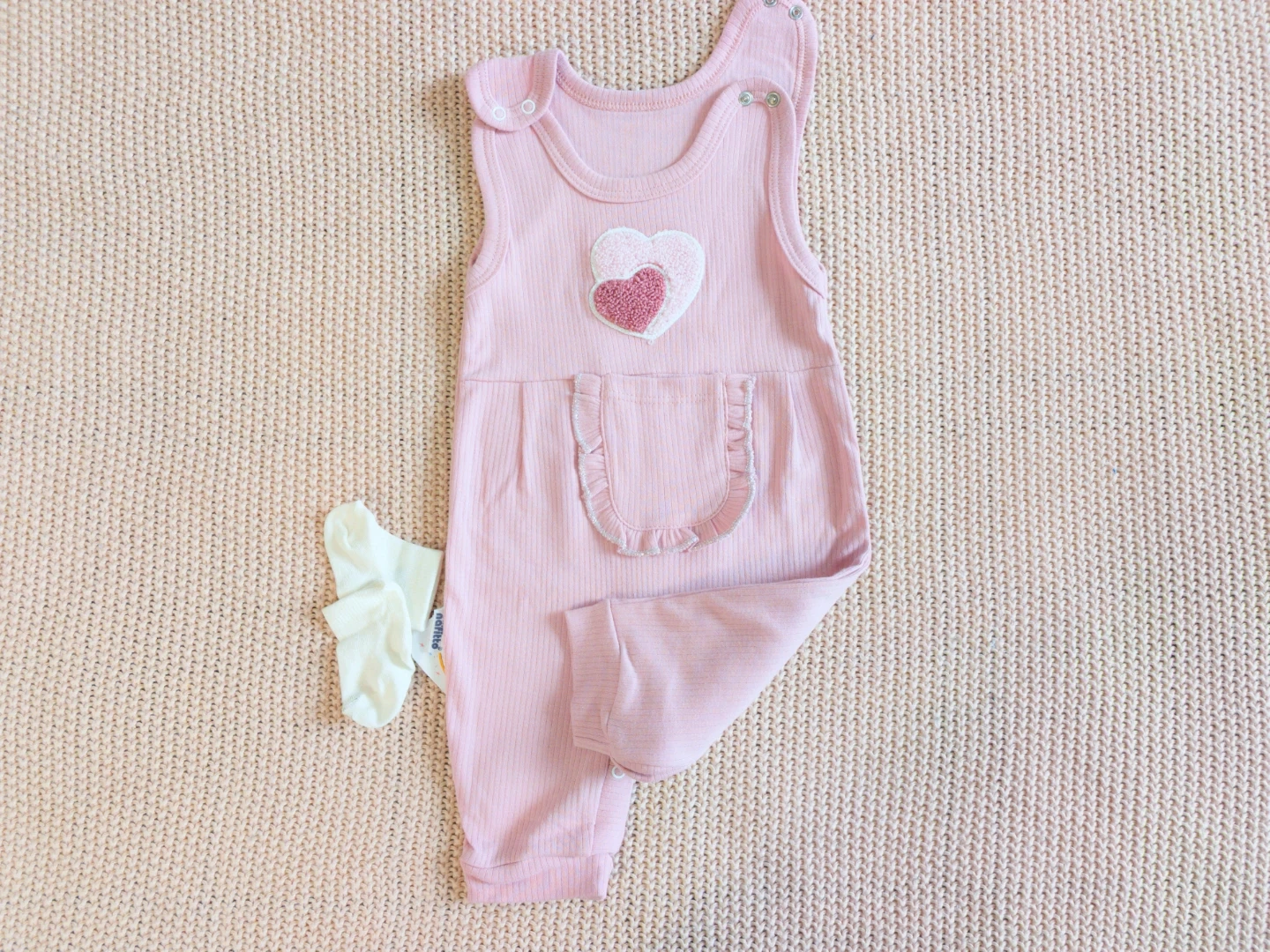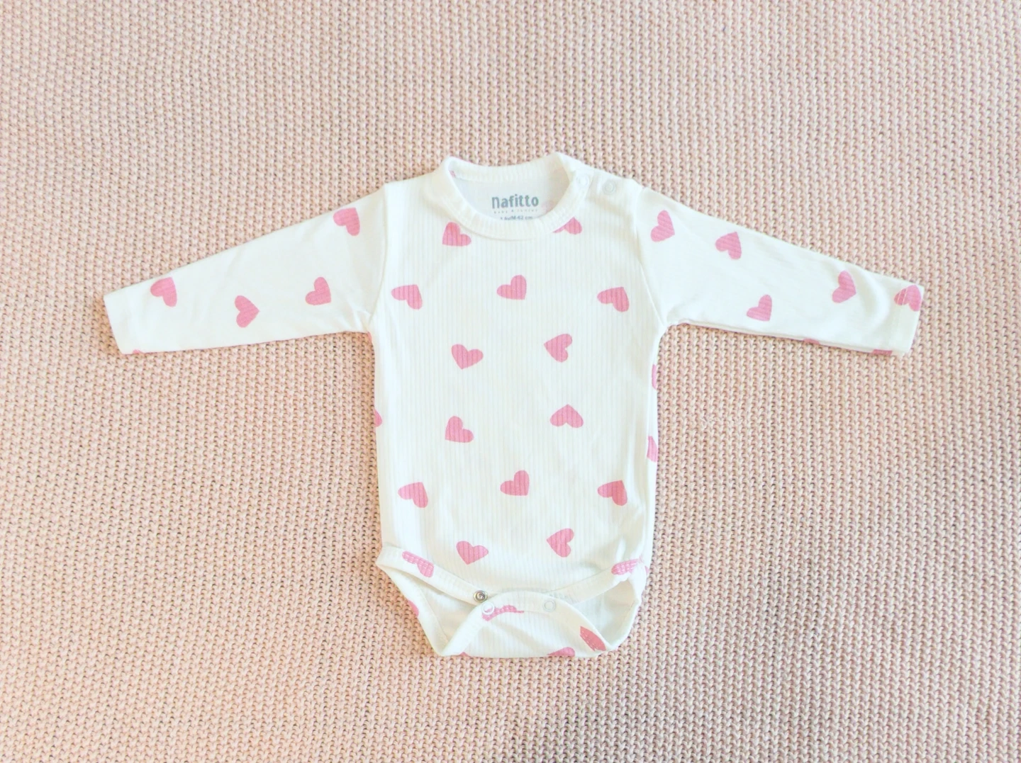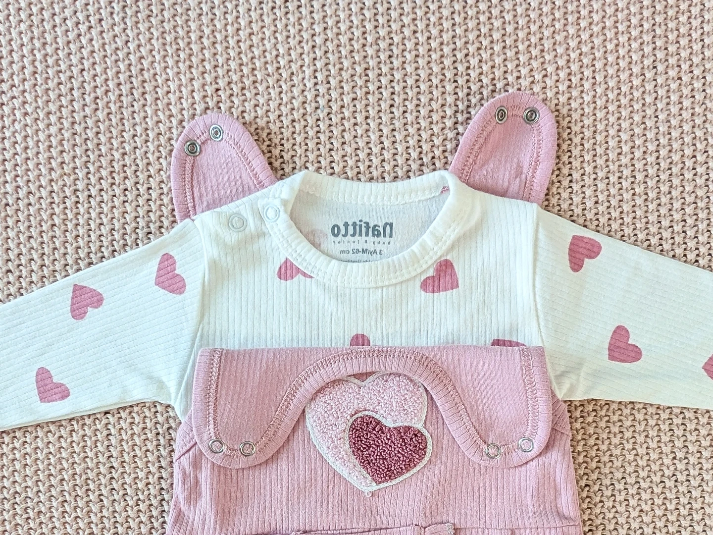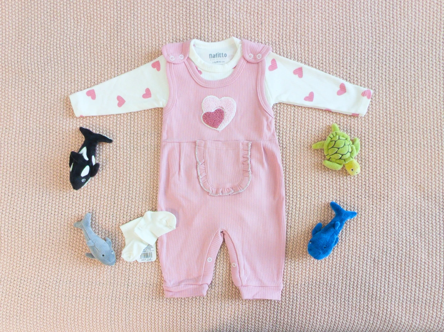 Adorable Nafitto baby set featuring a pink ribbed onesie with heart appliques and a white long-sleeved bodysuit covered in small pink hearts. It's perfect for your little one's everyday comfort and style. The onesie has a cute ruffled pocket detail.