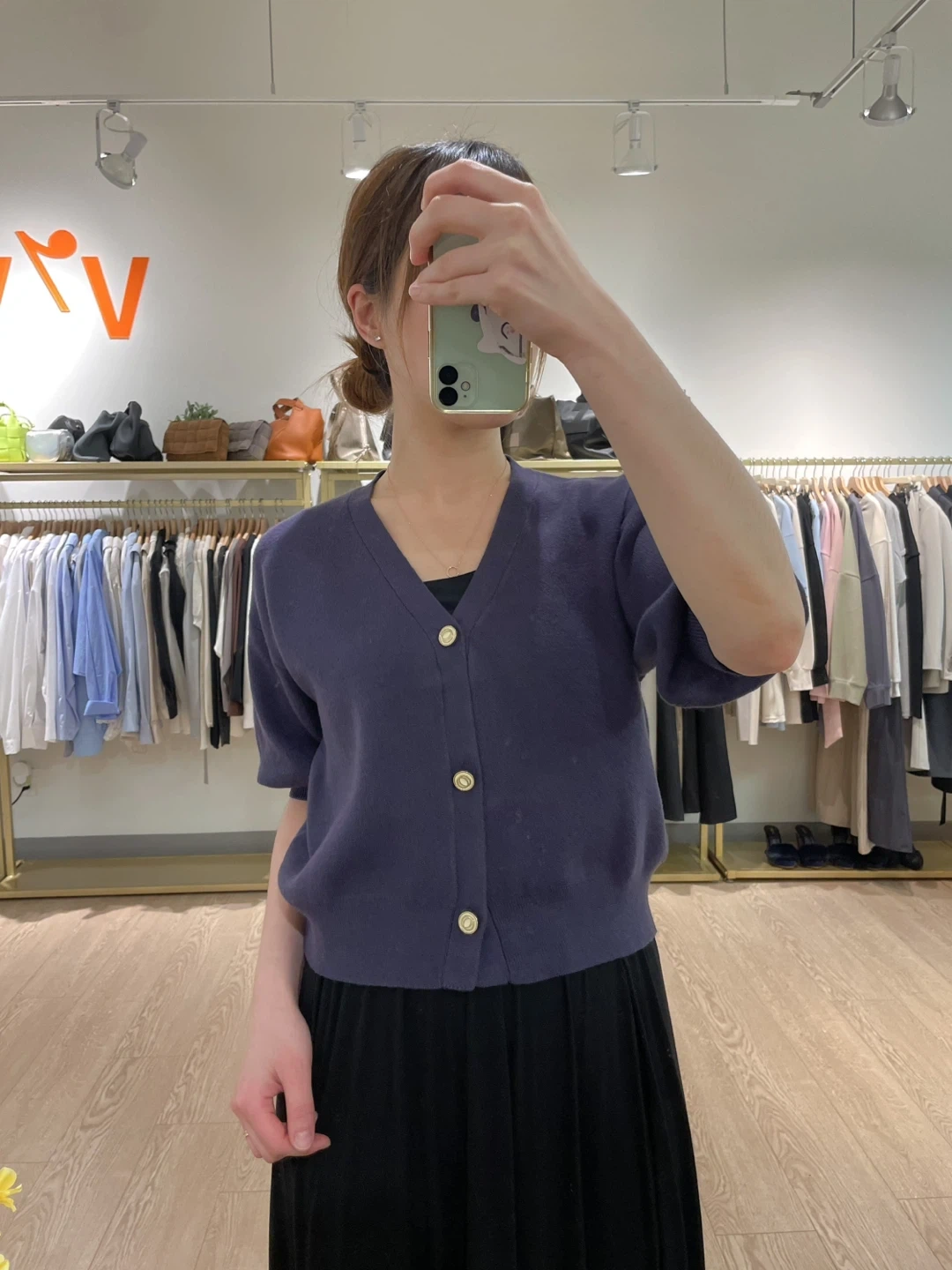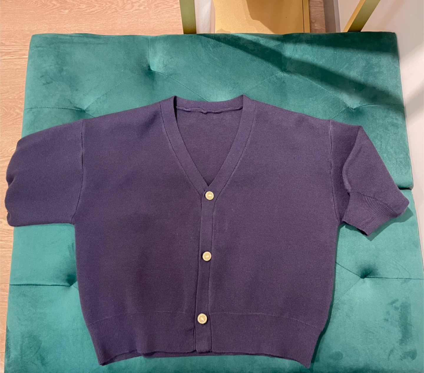 A cute navy blue cardigan that would be perfect for layering or wearing on its own! It has short sleeves and detailed buttons, giving it a classic look.