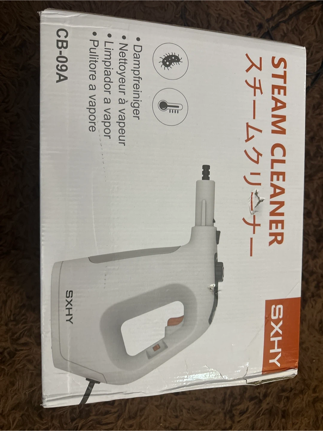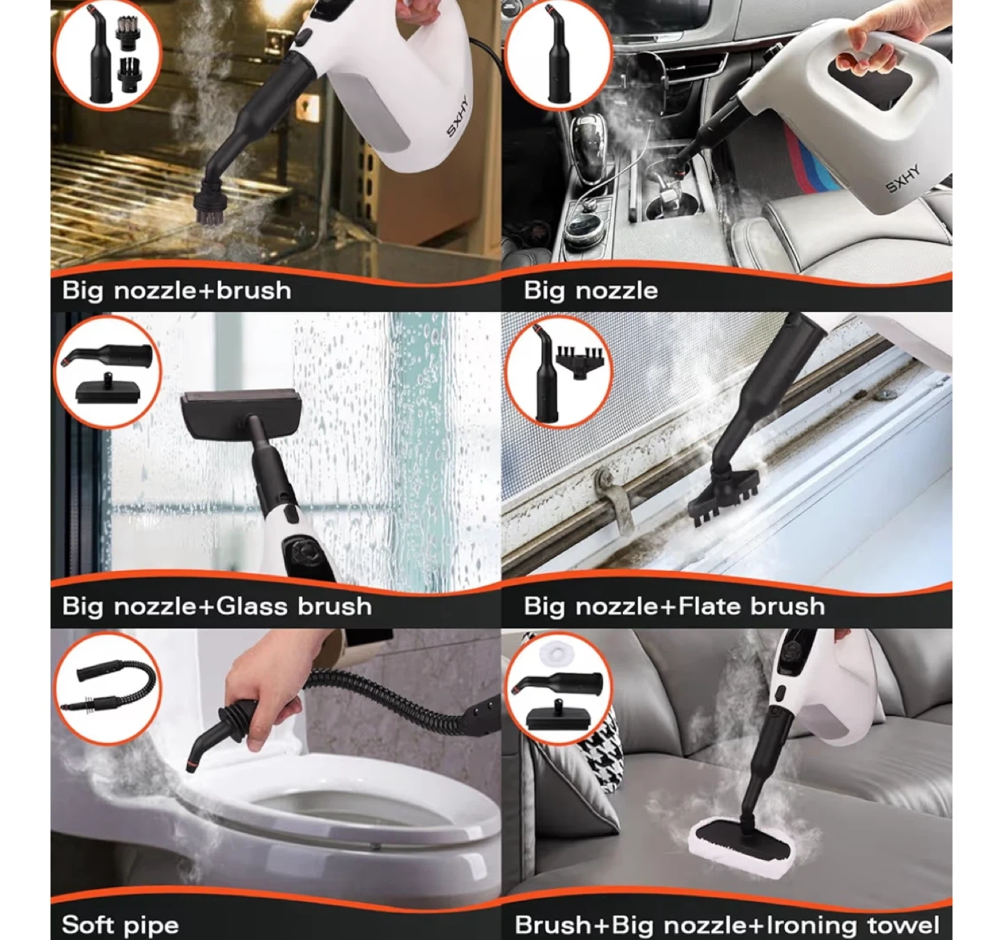 I'm selling a high temperature steam cleaner by SXHY. It cleans and sanitizes, eliminating 99.9% of germs and bacteria! It comes with multiple attachments for different cleaning needs, including a big nozzle and brush, glass brush, and flat brush. The steam cleaner is designed to aim the steam at stains as close as possible for better cleaning