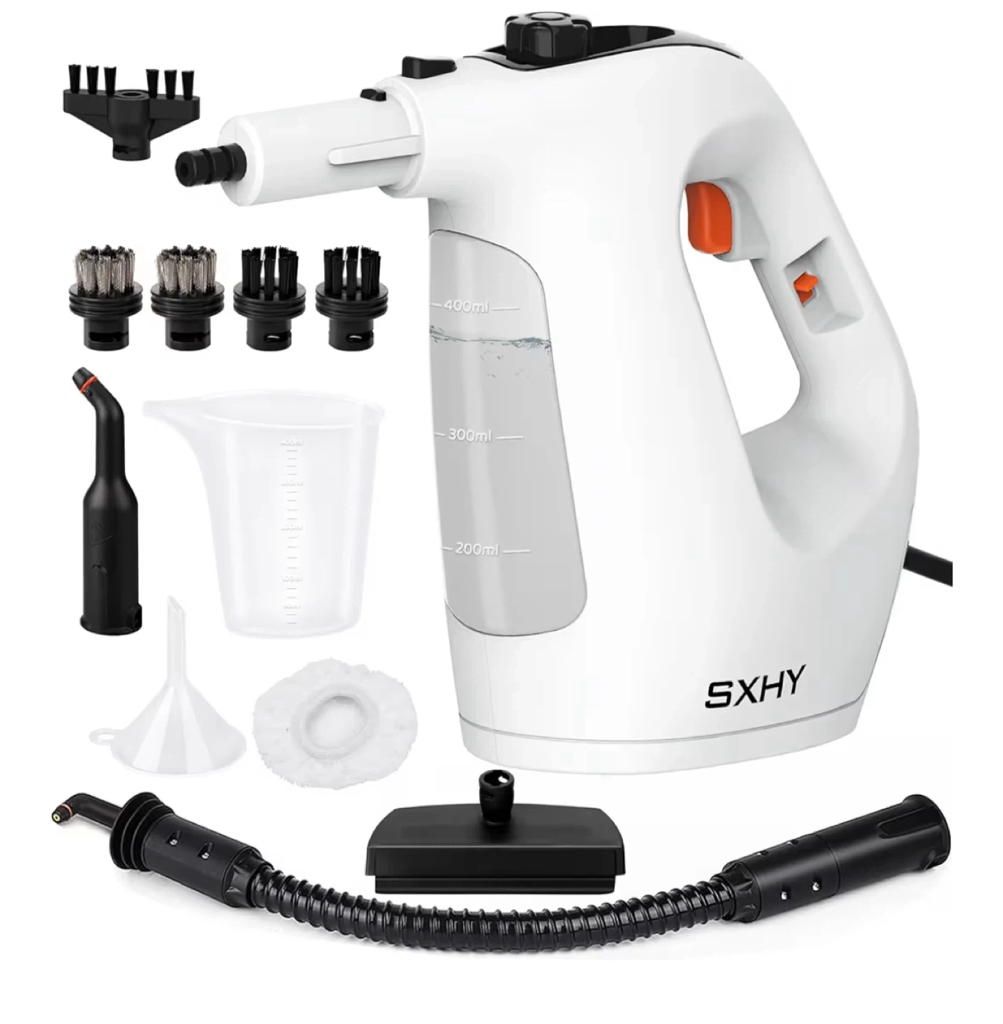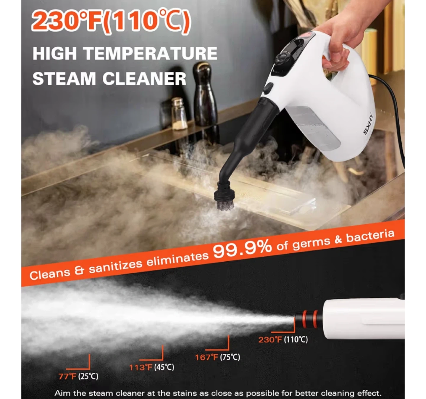 I'm selling a high temperature steam cleaner by SXHY. It cleans and sanitizes, eliminating 99.9% of germs and bacteria! It comes with multiple attachments for different cleaning needs, including a big nozzle and brush, glass brush, and flat brush. The steam cleaner is designed to aim the steam at stains as close as possible for better cleaning