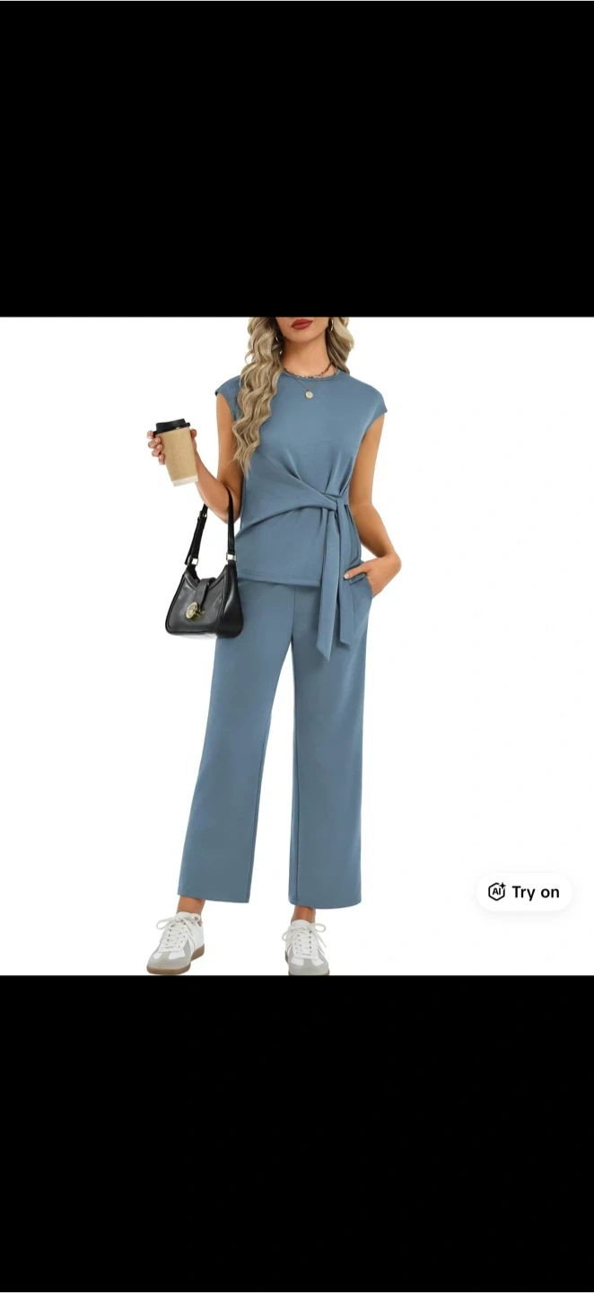 Casly Lamiit Women's 2 Piece Set - Soft Fabric Round Neck Cap Sleeve Top with Belted Tie & Crop Wide Leg Pants - Versatile Travel & Everyday Wear #Springfresh