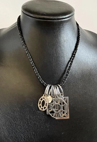 Dyrberg Kern DENMARK DESIGNER Geometric CHARM Necklace on braided leather cord. The necklace is 28 inches long and weighs 32 grams. There are 5 geometric shape charms and 2 name tags included. In good condition.