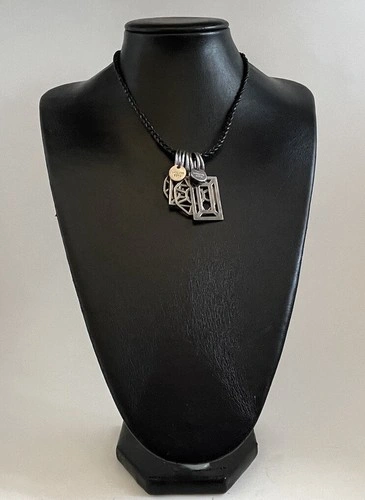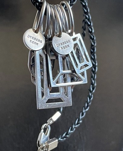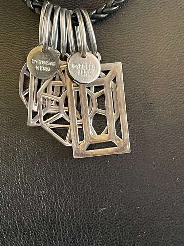Dyrberg Kern DENMARK DESIGNER Geometric CHARM Necklace on braided leather cord. The necklace is 28 inches long and weighs 32 grams. There are 5 geometric shape charms and 2 name tags included. In good condition.