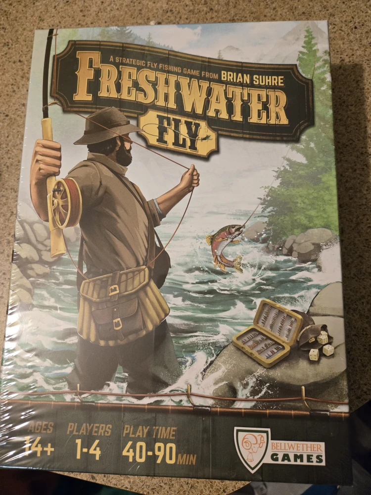 Selling a brand new, still-in-shrink-wrap copy of Freshwater Fly, a strategic fly fishing game by Brian Suhre! This game is for ages 14+, supports 1-4 players, and has a playtime of 40-90 minutes. Get ready to cast your line!