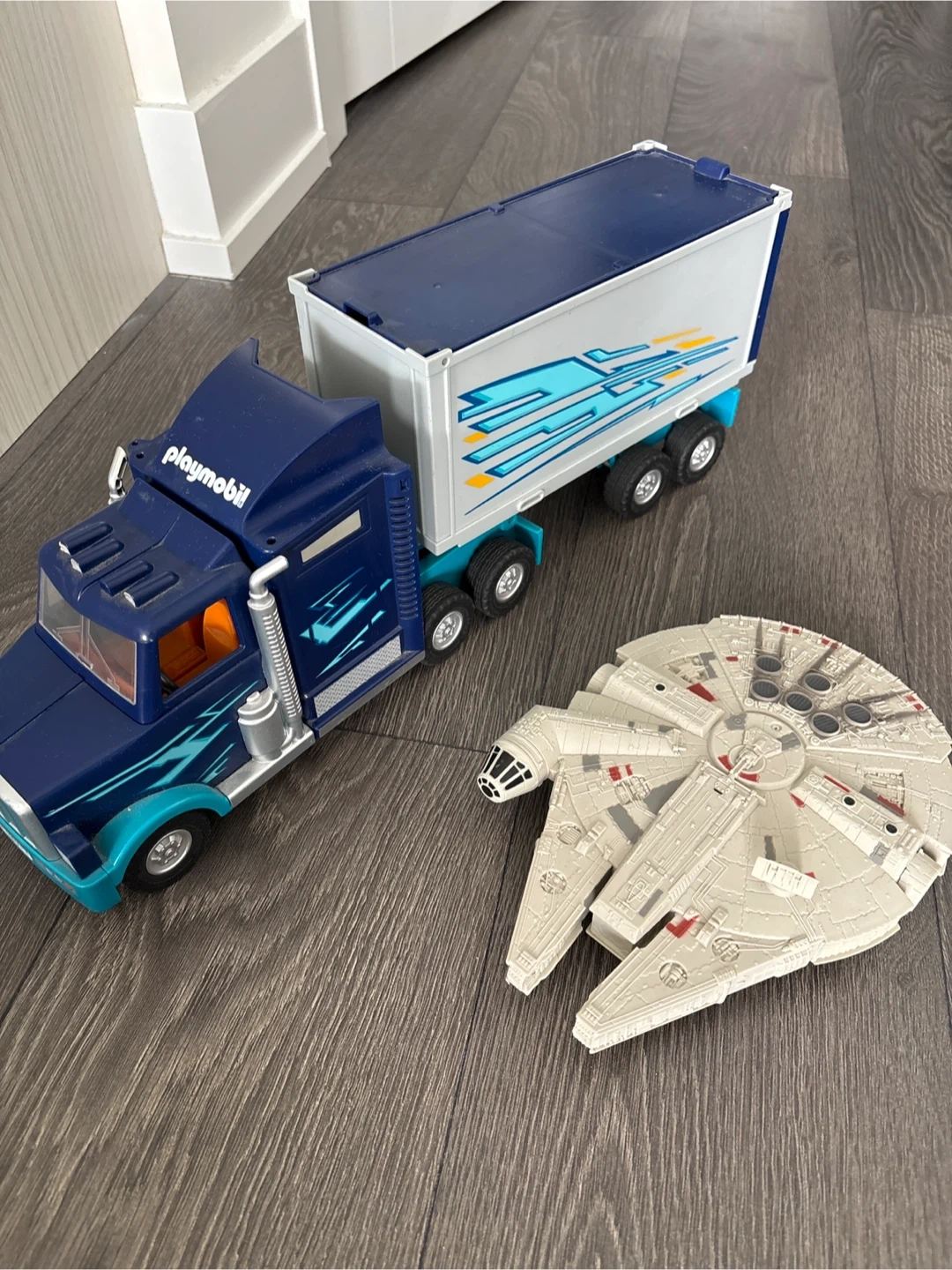 A Playmobil semi-truck toy with a blue cab and a white trailer. Features blue and white graphic designs on the trailer. It's made of durable plastic. This toy is great for imaginative play for kids. And Millennium Falcon model