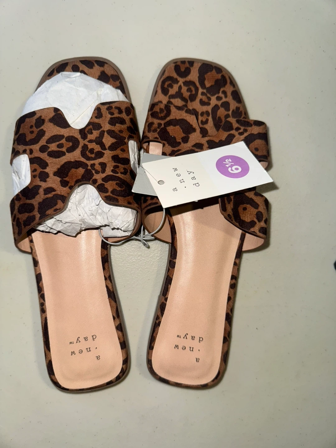 These A New Day slide sandals feature a fun leopard print. The size is 6.5. They have a comfortable slip-on design.