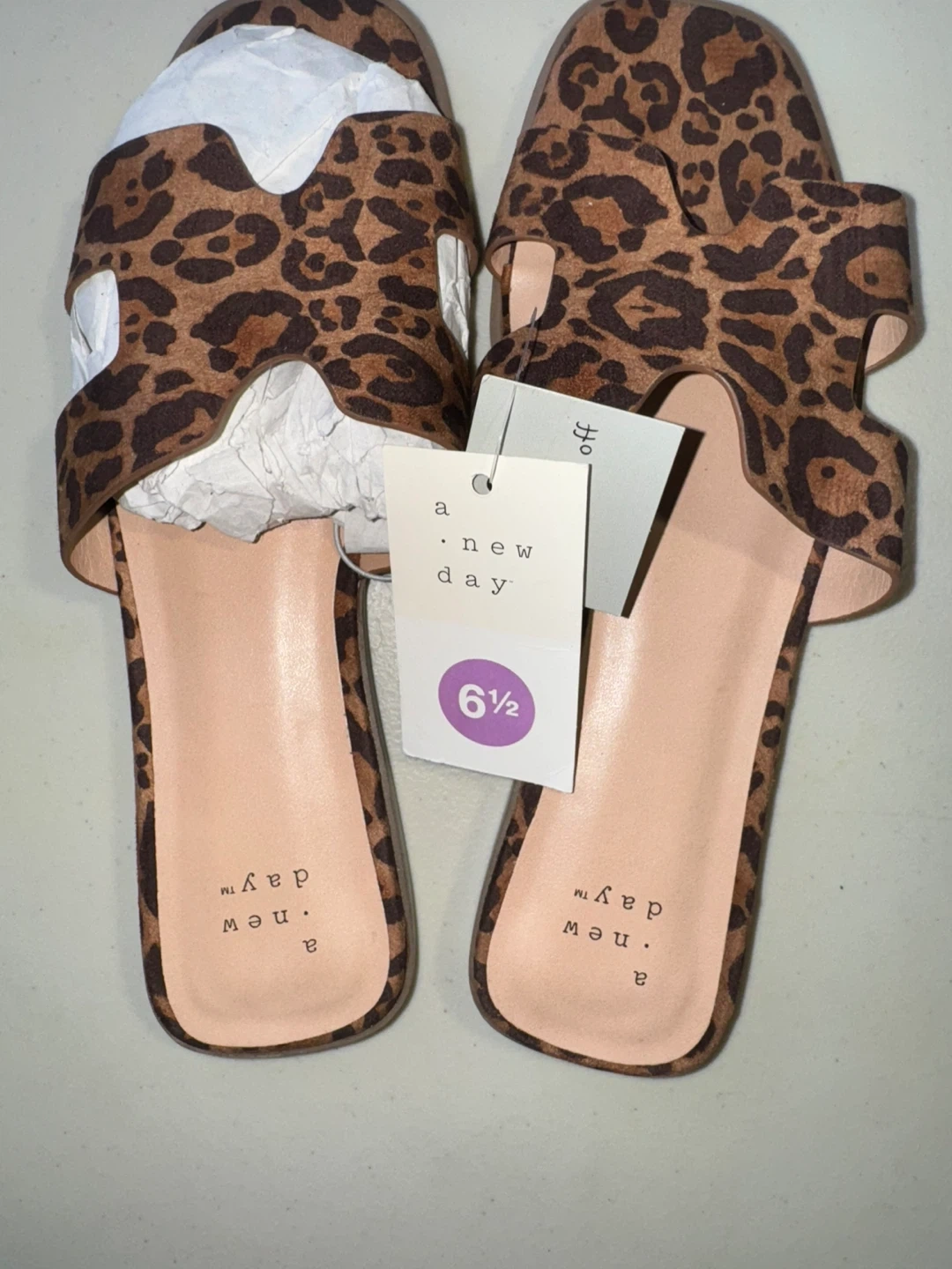 These A New Day slide sandals feature a fun leopard print. The size is 6.5. They have a comfortable slip-on design.