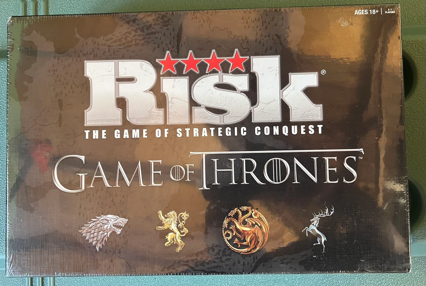 Based on the epic HBO series, this Game of Thrones Risk game features two ways to play. Compete for control of Westeros during the War of the Five Kings, or Daenerys Targaryen's rise to power in Essos. Includes 2 game board maps (Westeros & Essos), 315 Army Pieces for Houses Stark, Baratheon, Lannister, Martell, Tyrell, Targaryen & Ghiscari, 7 Seats of Power, 7 Player Boards, 188 Cards (Territory, Objective, Character & Maester), 63 Special Unit Tokens, 75 Gold Dragon Coins, 9 Dice, and an Instructions Booklet. For 2-7 players, recommended for ages 18 and up. Brand new condition in original packaging. Wipe clean with a dry or damp cloth.