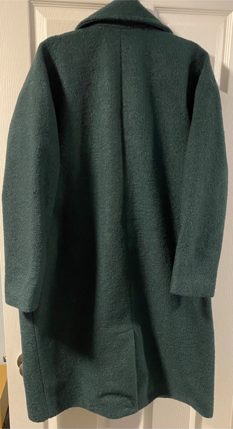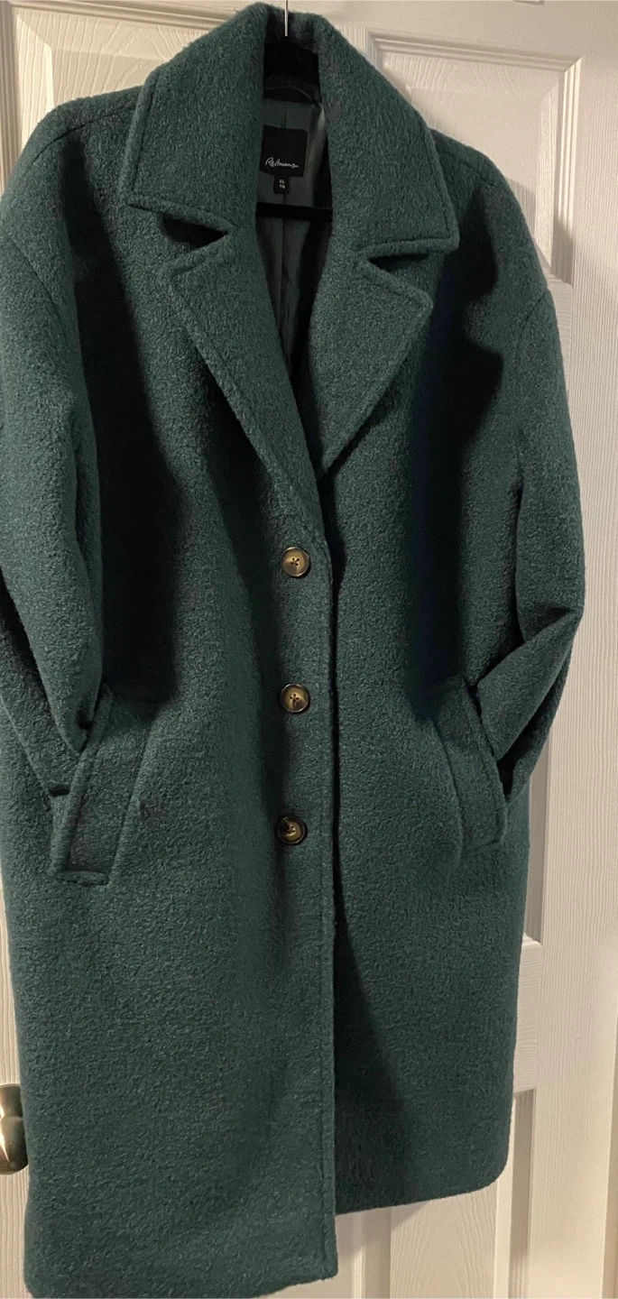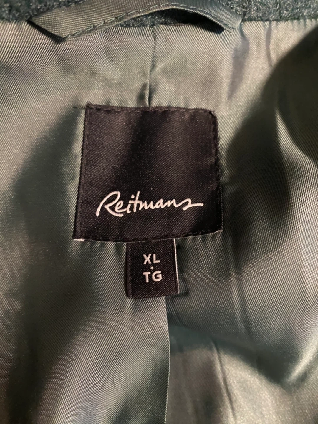 Cozy up in this stylish Reitmans women's coat. It's a size XL and features a deep green colour. This coat is made from a wool blend, making it perfect for cooler weather! Two side pockets - 3 large buttons (spare in pocket) full length - worn once.