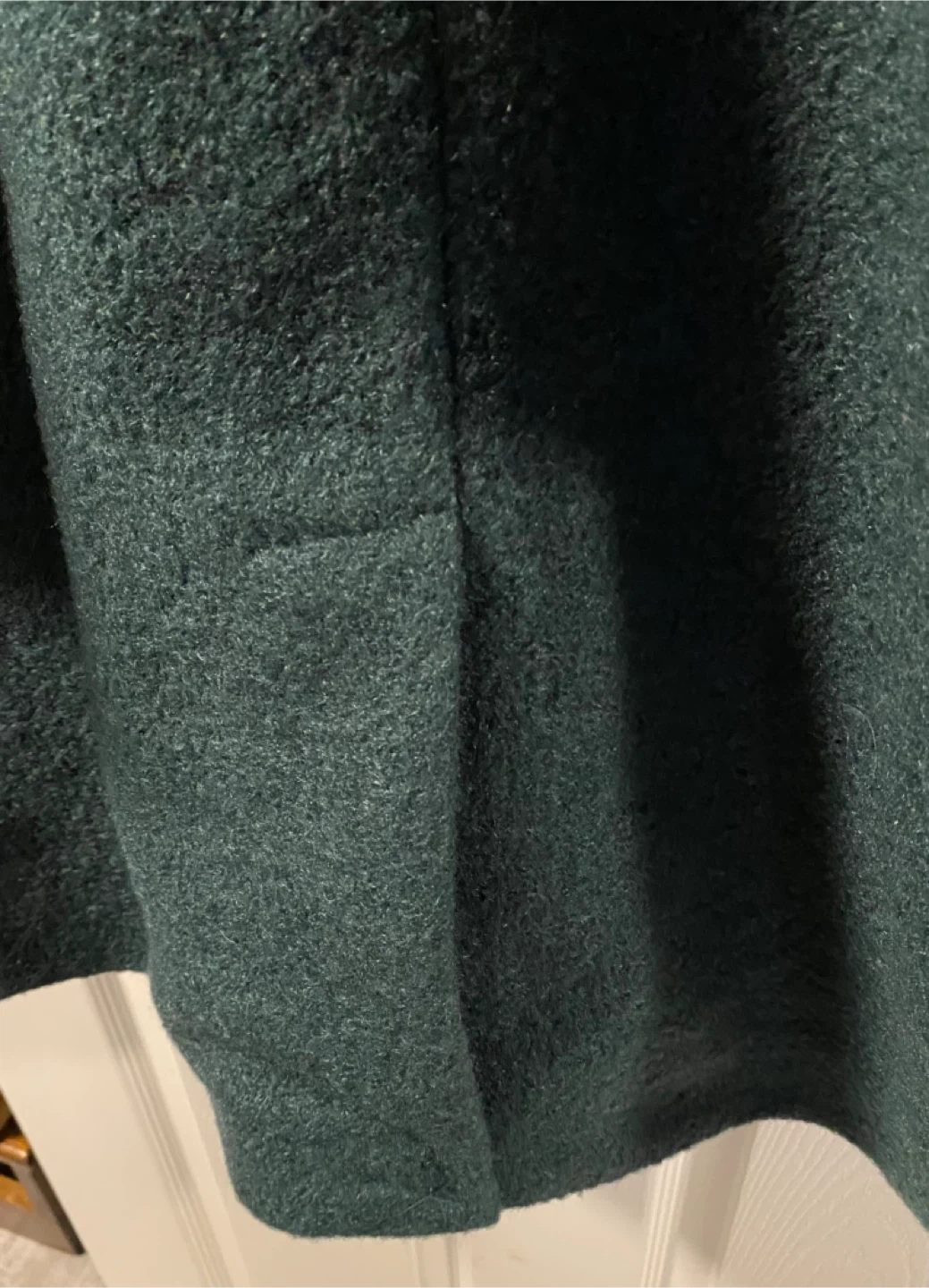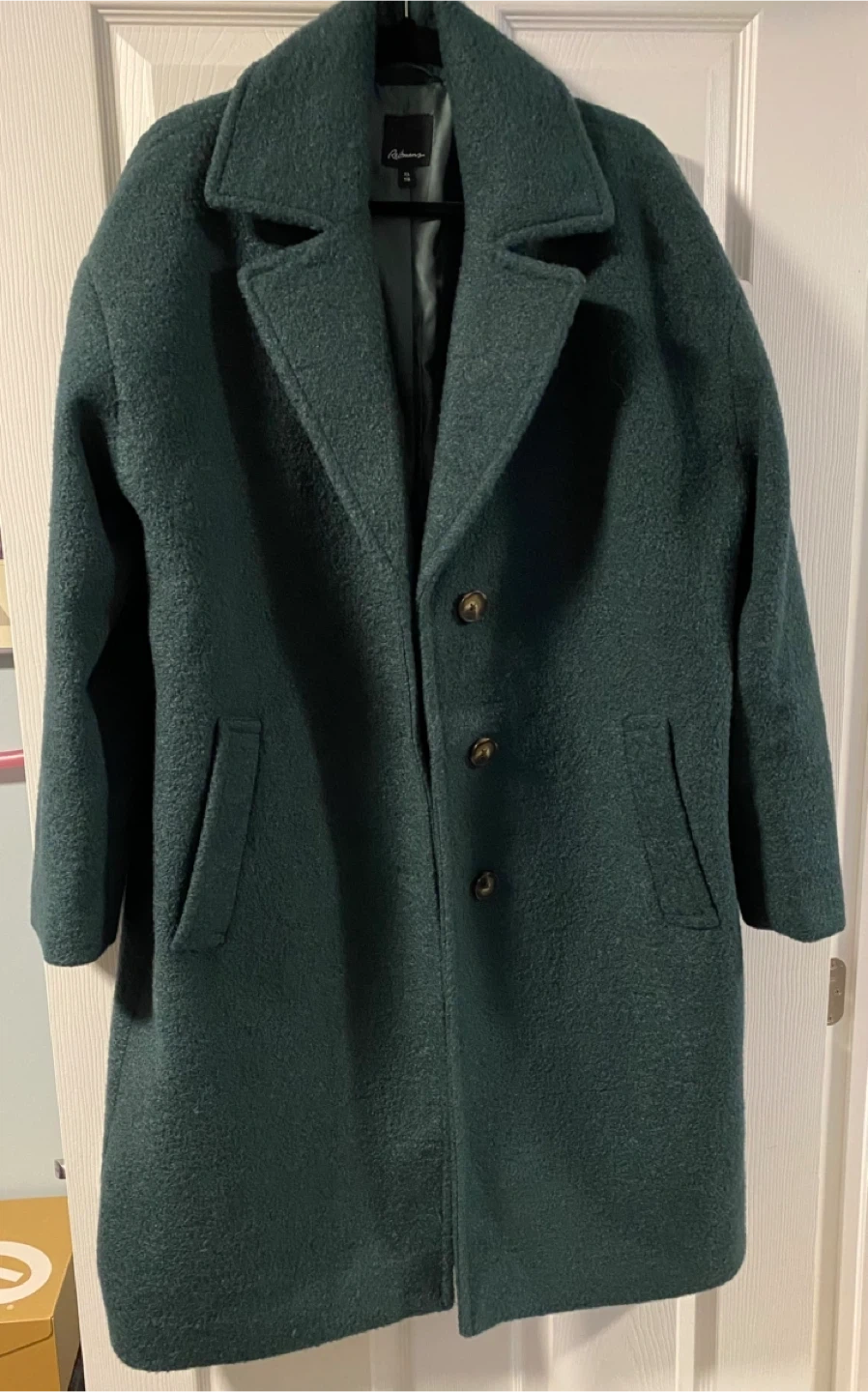 Cozy up in this stylish Reitmans women's coat. It's a size XL and features a deep green colour. This coat is made from a wool blend, making it perfect for cooler weather! Two side pockets - 3 large buttons (spare in pocket) full length - worn once.