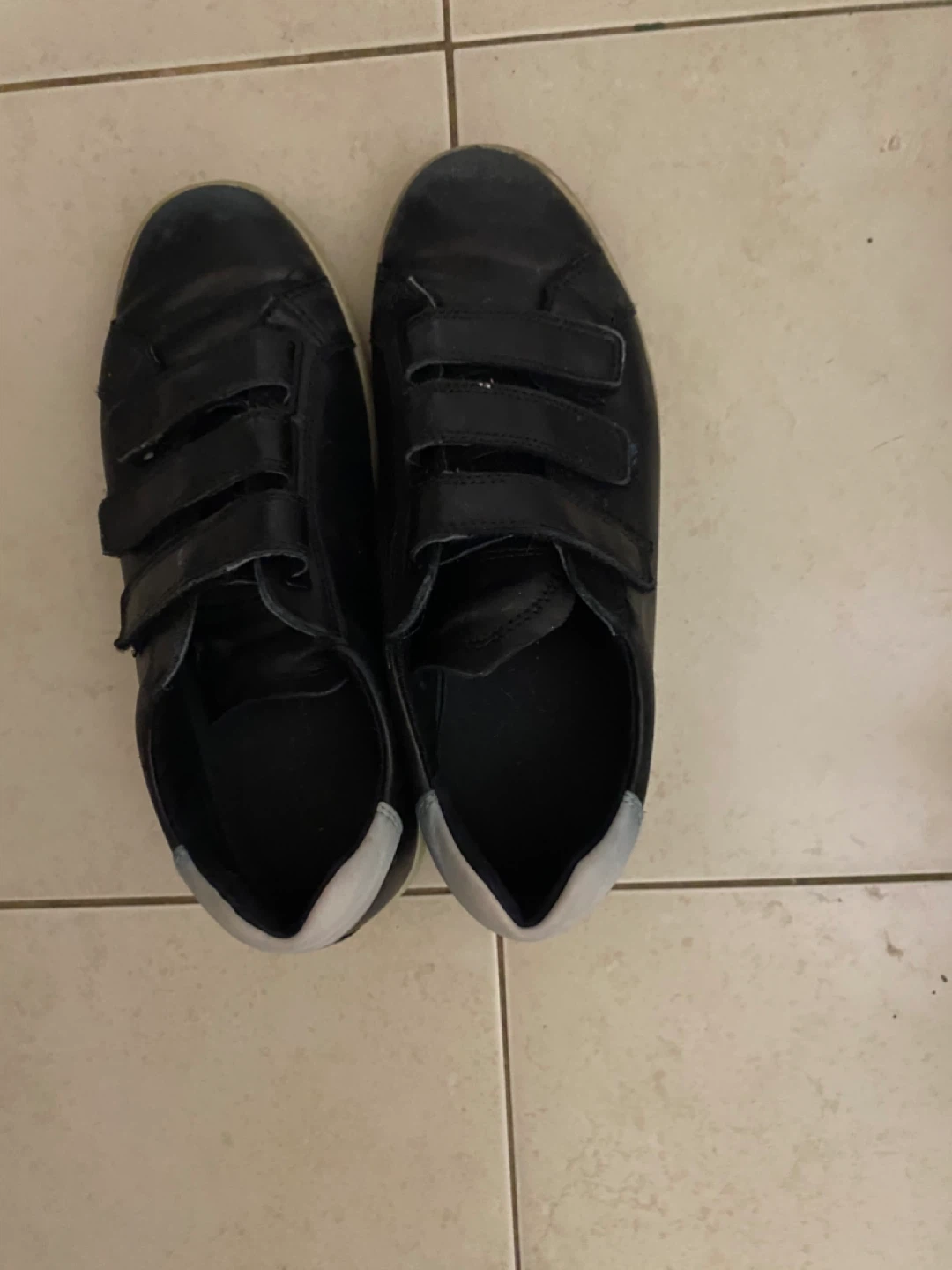 These are ECCO black leather shoes with three hook-and-loop straps for closure. They have a light grey heel accent. Perfect for easy on and off!