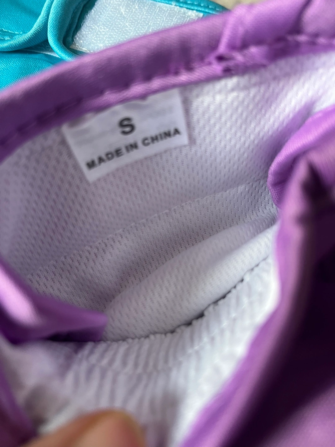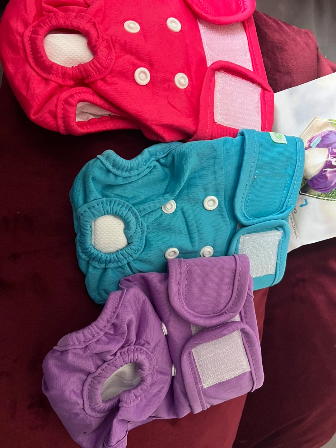 Wegreeco Premium Dog Diapers Female(3 Pack) - Durable washable Reusable cloth diapers in pink, blue, and purple. Each diaper features adjustable hook-and-loop closures and elastic leg cuffs for a snug fit. Size marked as small.