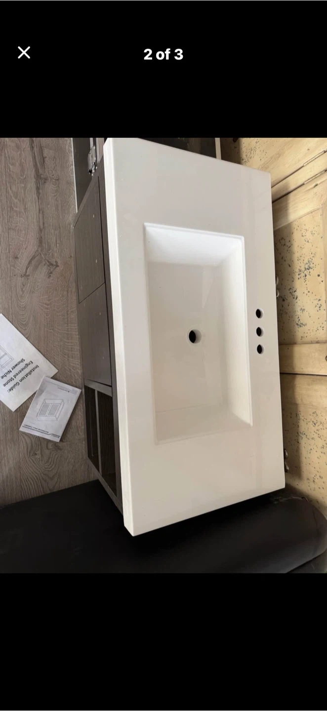 Selling a bathroom vanity with a sink. It features a modern design with a white ceramic sink top and a gray wood-grain cabinet. It also comes with an original receipt,just bought it, it’s a wrong size. 4164562341