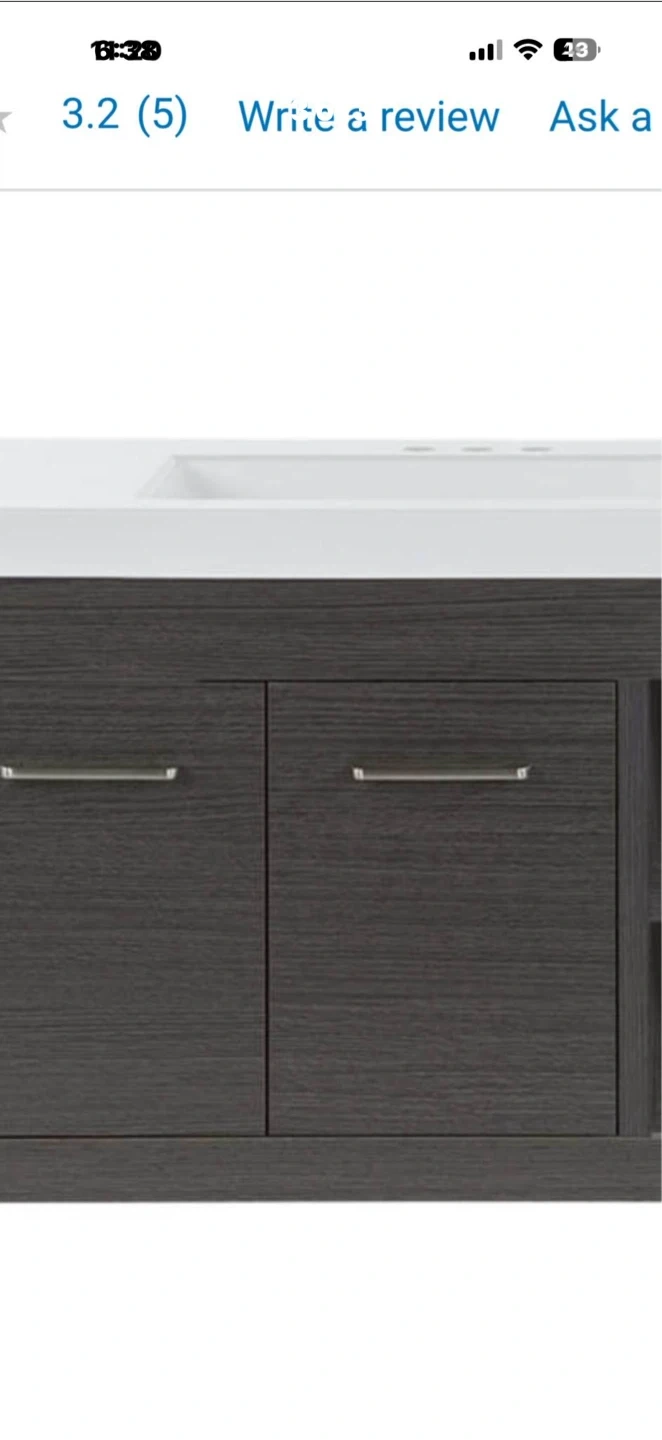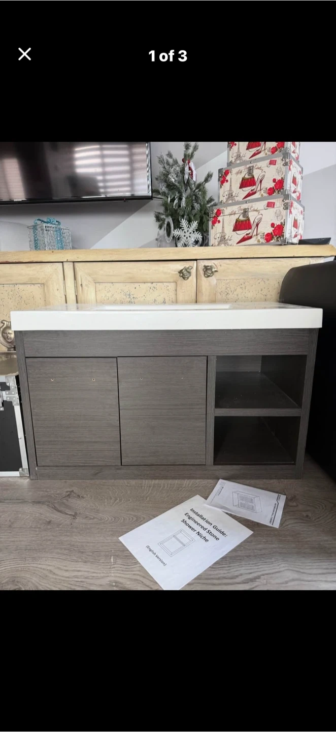 Selling a bathroom vanity with a sink. It features a modern design with a white ceramic sink top and a gray wood-grain cabinet. It also comes with an original receipt,just bought it, it’s a wrong size. 4164562341