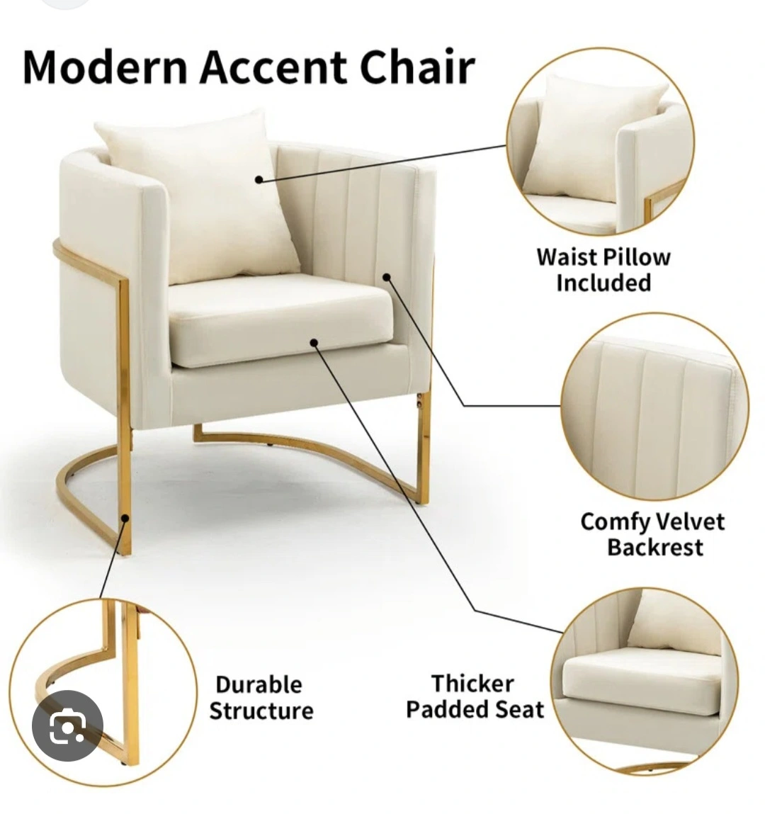 Looking to add a touch of modern elegance to your space? This accent chair features a comfy velvet backrest and a thicker padded seat, perfect for relaxing. The durable structure and included waist pillow add to the comfort and style. It's an eye-catching piece that will elevate any room!