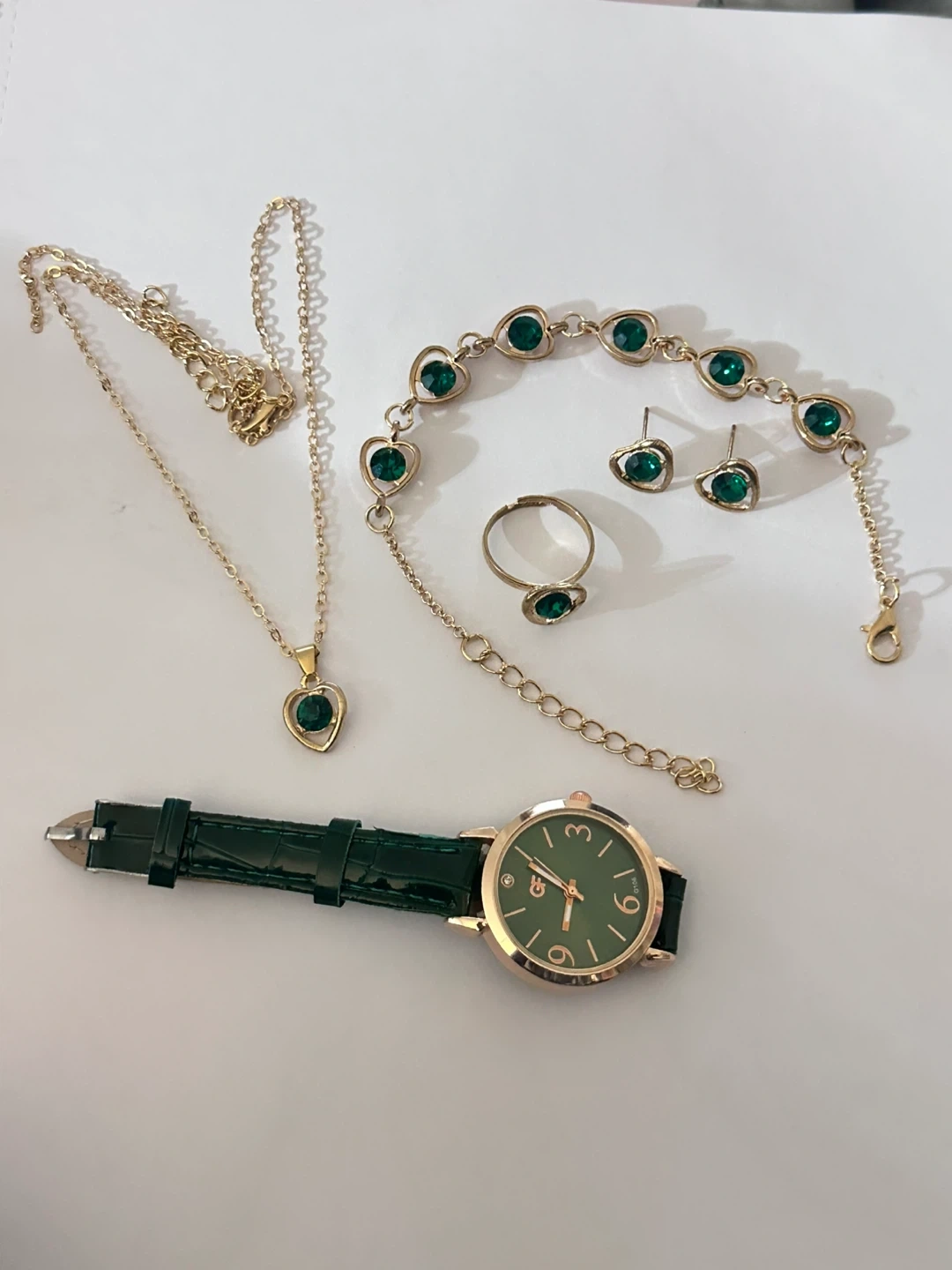 This set includes a necklace, bracelet, ring, and earrings, all featuring a heart-shaped green gem. It also comes with a green-strapped wristwatch. It's a lovely coordinating set!