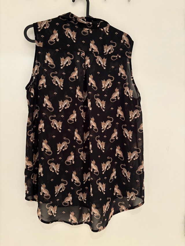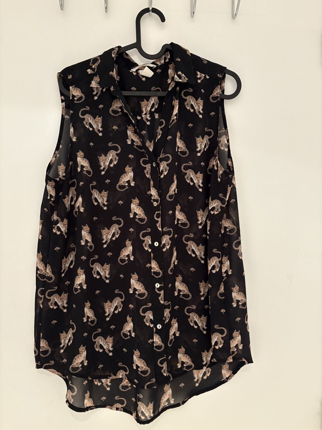H&M sheer black top with a unique cat print, size 12. Good condition. Features a button-down front and lightweight fabric, perfect for layering or wearing on its own. If you're seeing this ad, the top is still available! Pick up at King and Portland, cash only.