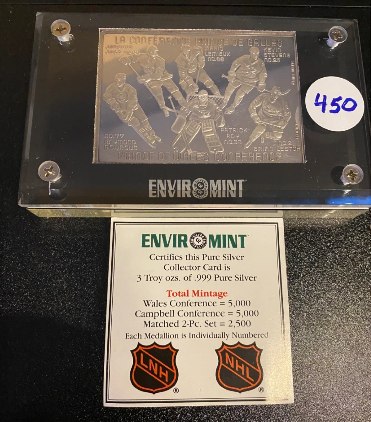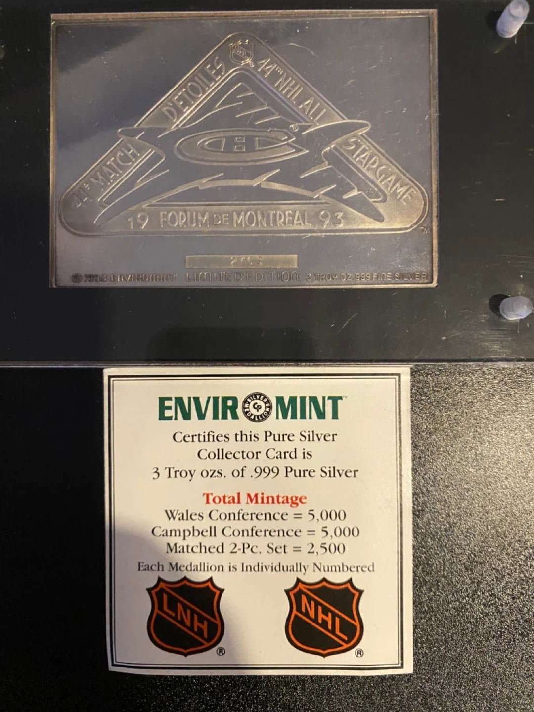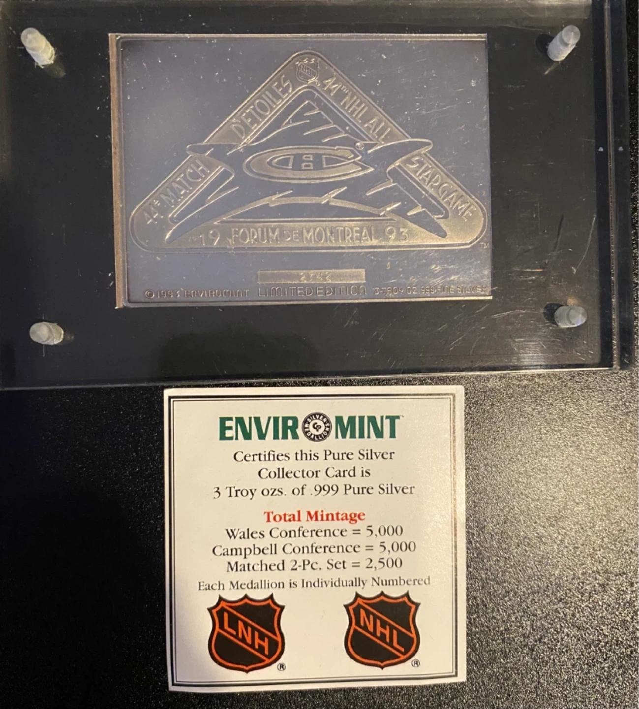 This limited edition silver bar commemorates the 1993 NHL All-Star Game held at the Forum de Montreal. It features the Prince of Wales Conference on one side and the Clarence Campbell Conference on the other. Struck by Enviromint, it's 999 fine silver.