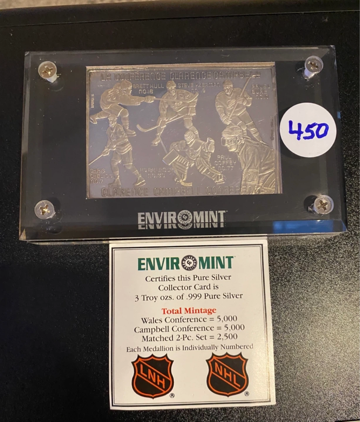 This limited edition silver bar commemorates the 1993 NHL All-Star Game held at the Forum de Montreal. It features the Prince of Wales Conference on one side and the Clarence Campbell Conference on the other. Struck by Enviromint, it's 999 fine silver.