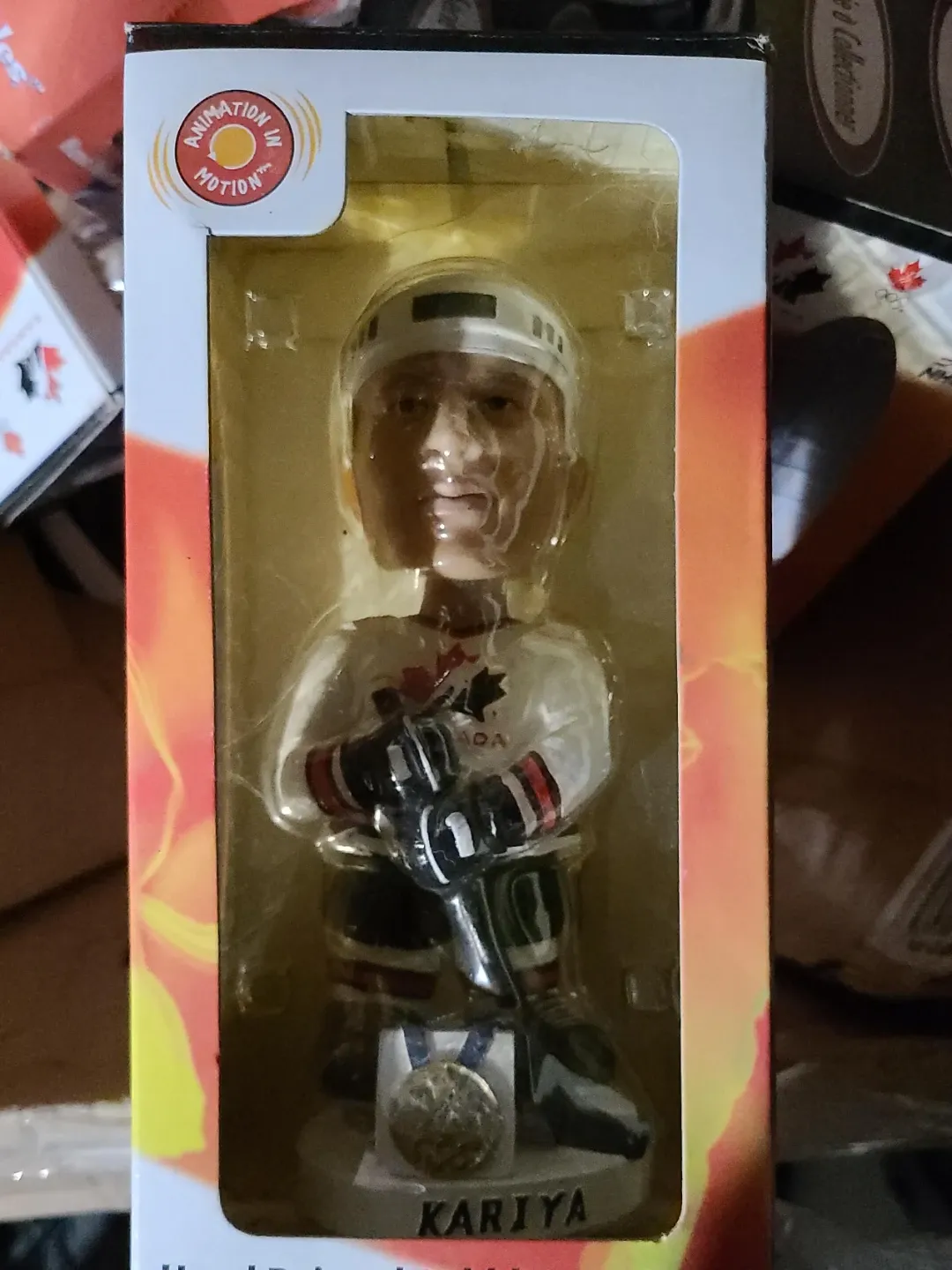 This bobblehead features a hockey player named Kariya in a Canadian jersey. It's from the "Animation in Motion" series. It comes in its original packaging.
