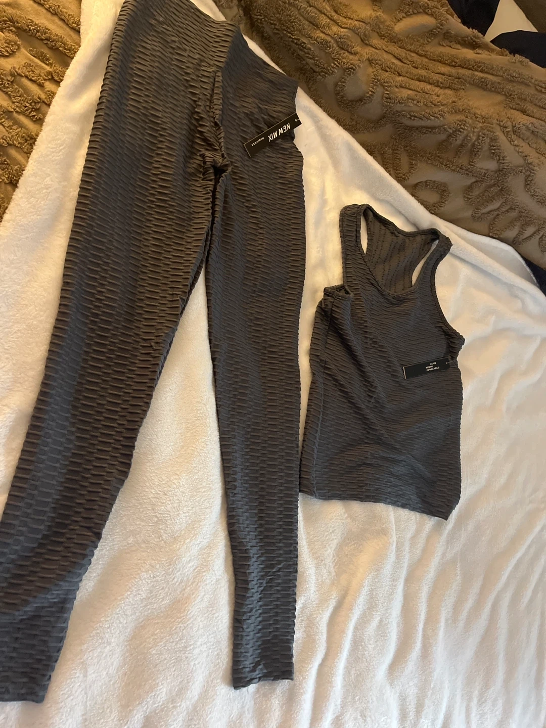 This workout set includes leggings and a matching tank top. Both pieces are made from a textured, stretchy fabric that's great for active wear. It's a two-piece set in a dark grey color. Perfect for gym sessions or casual wear! Charcoal