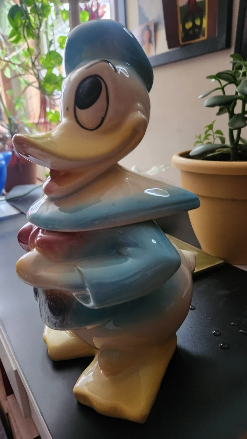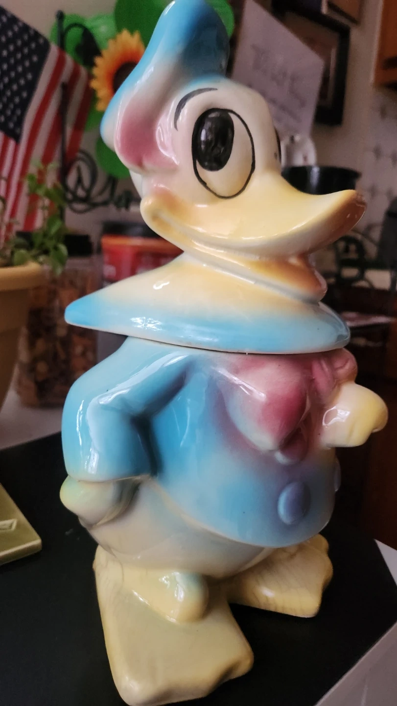 Selling a vintage Donald Duck stackable cookie jar! It's a fun and unique piece for any Disney collector or anyone looking to add a touch of whimsy to their kitchen. This ceramic cookie jar features Donald Duck in a stackable design. It's in good condition and ready to hold your favorite treats!