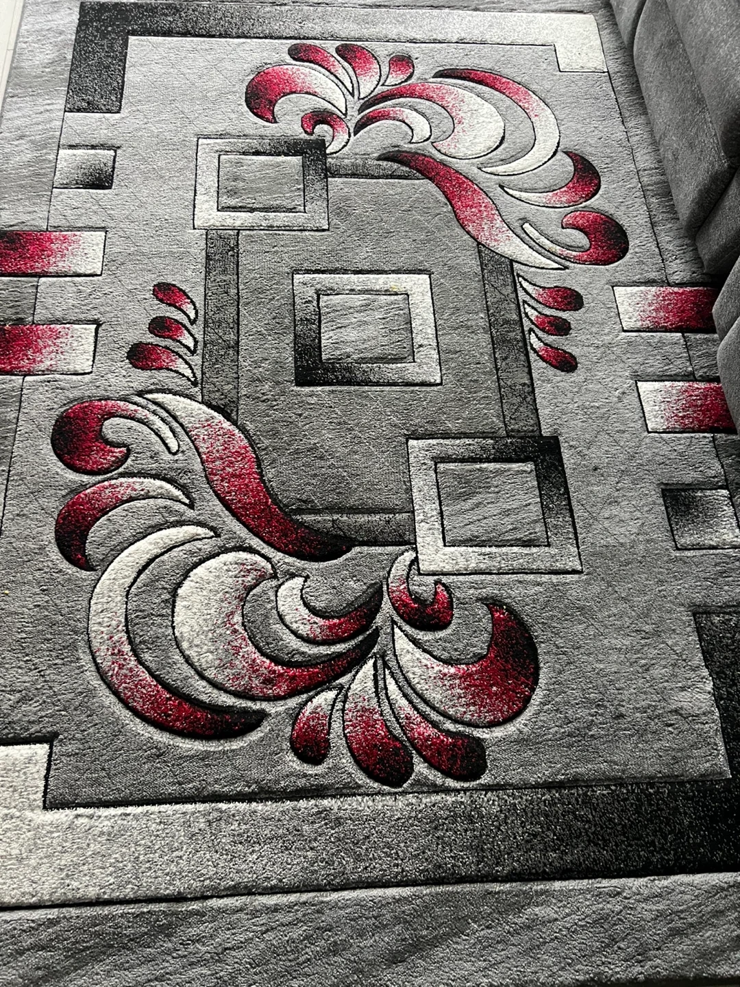This area rug features a modern design with grey as the base colour and a striking red and white floral pattern. It's a stylish addition to any room. Its dimensions are approximately 8 by 10 feet. This rug would work well in a living room or bedroom.