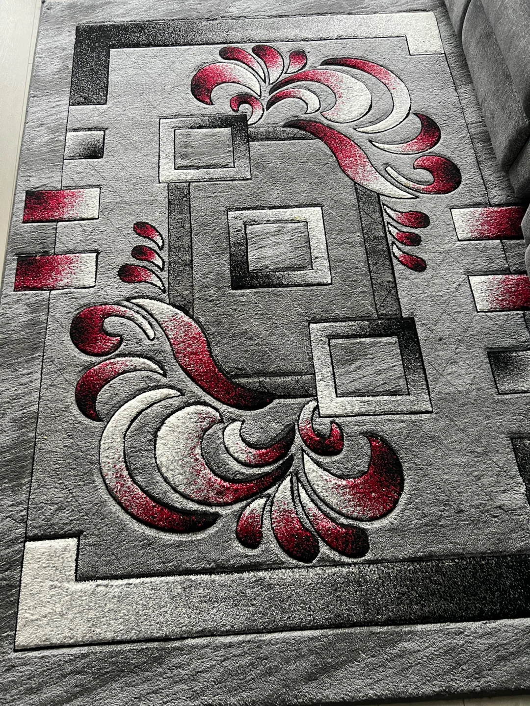 This area rug features a modern design with grey as the base colour and a striking red and white floral pattern. It's a stylish addition to any room. Its dimensions are approximately 8 by 10 feet. This rug would work well in a living room or bedroom.