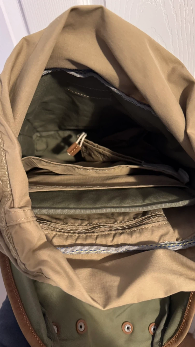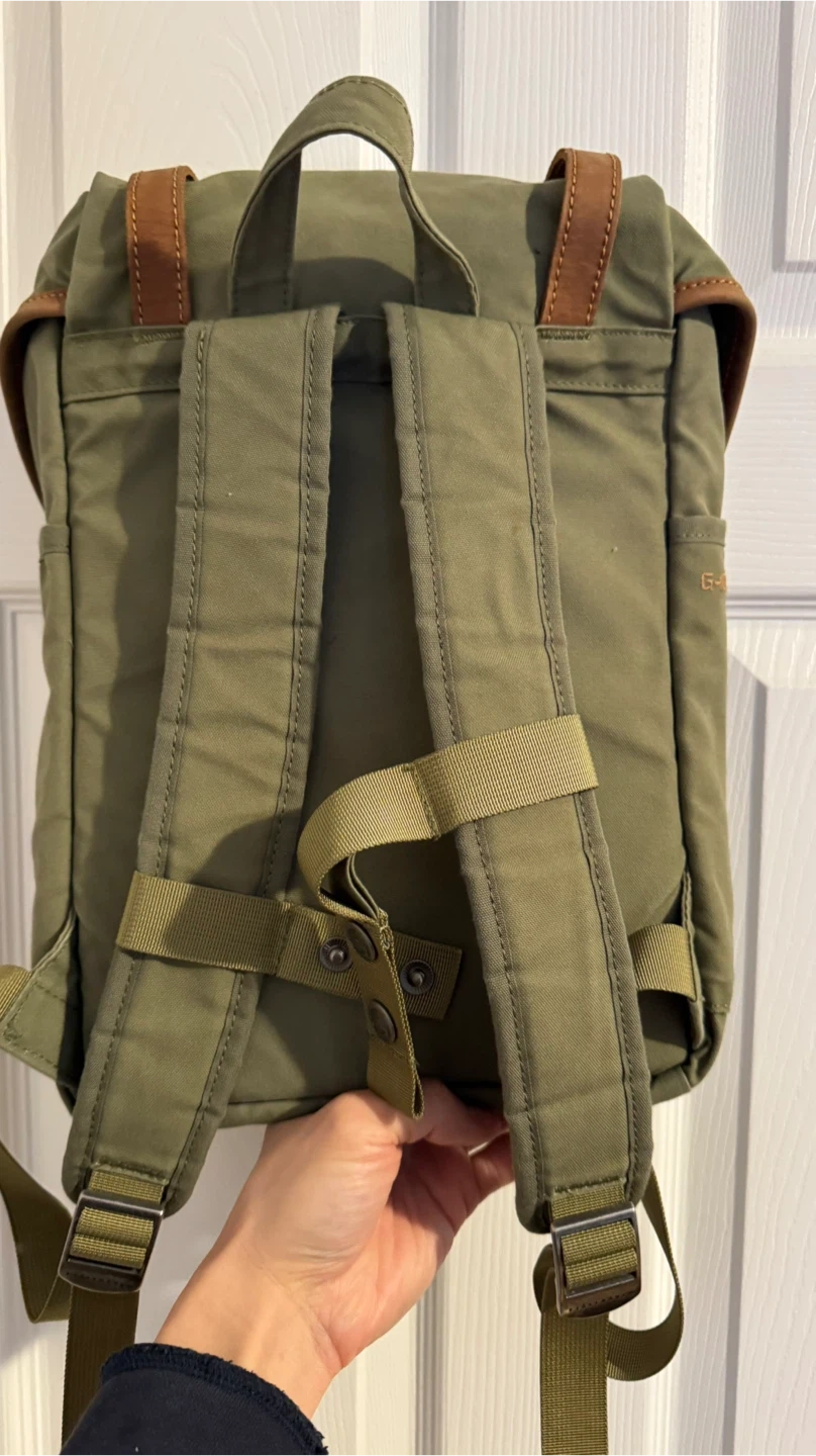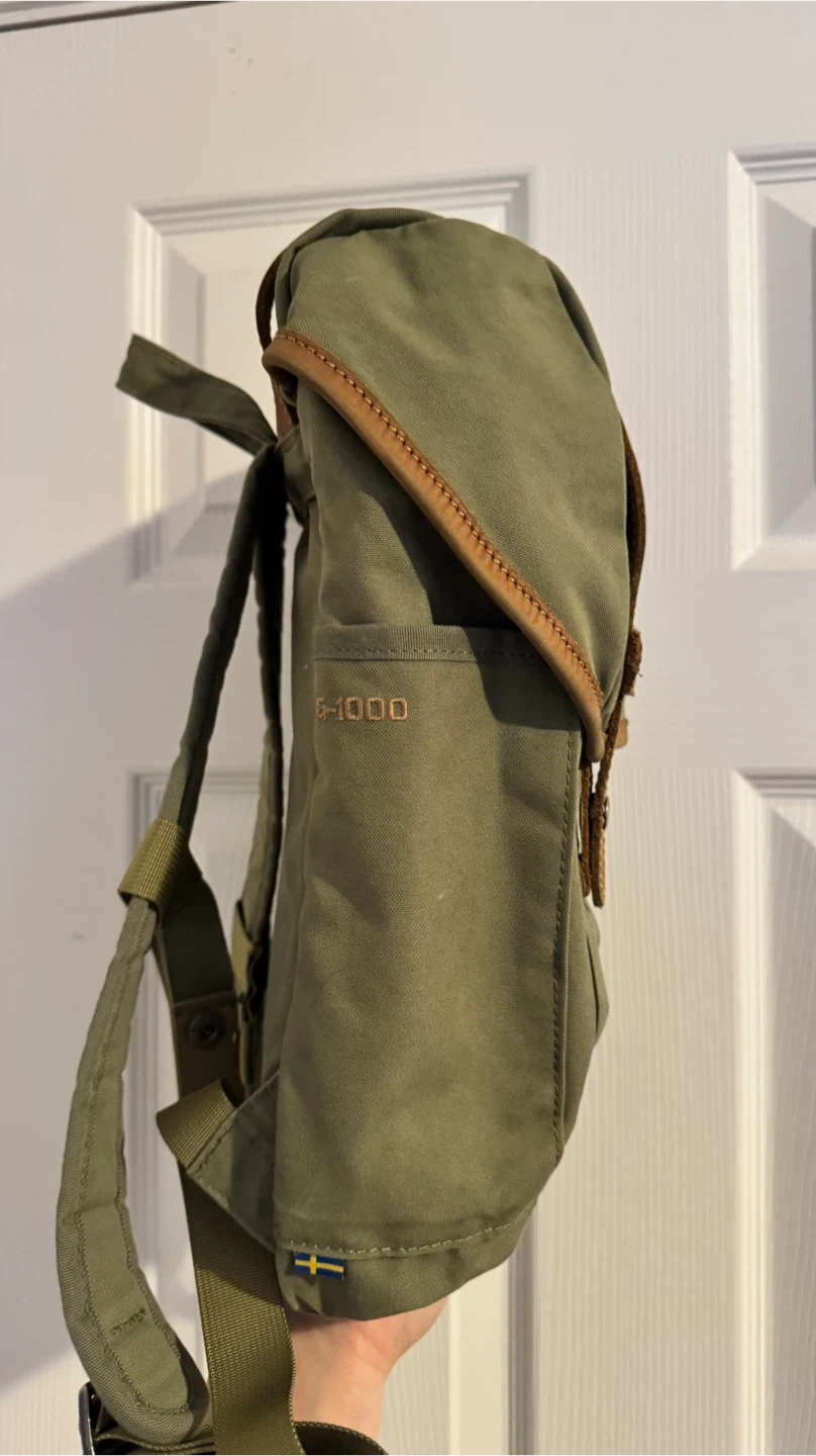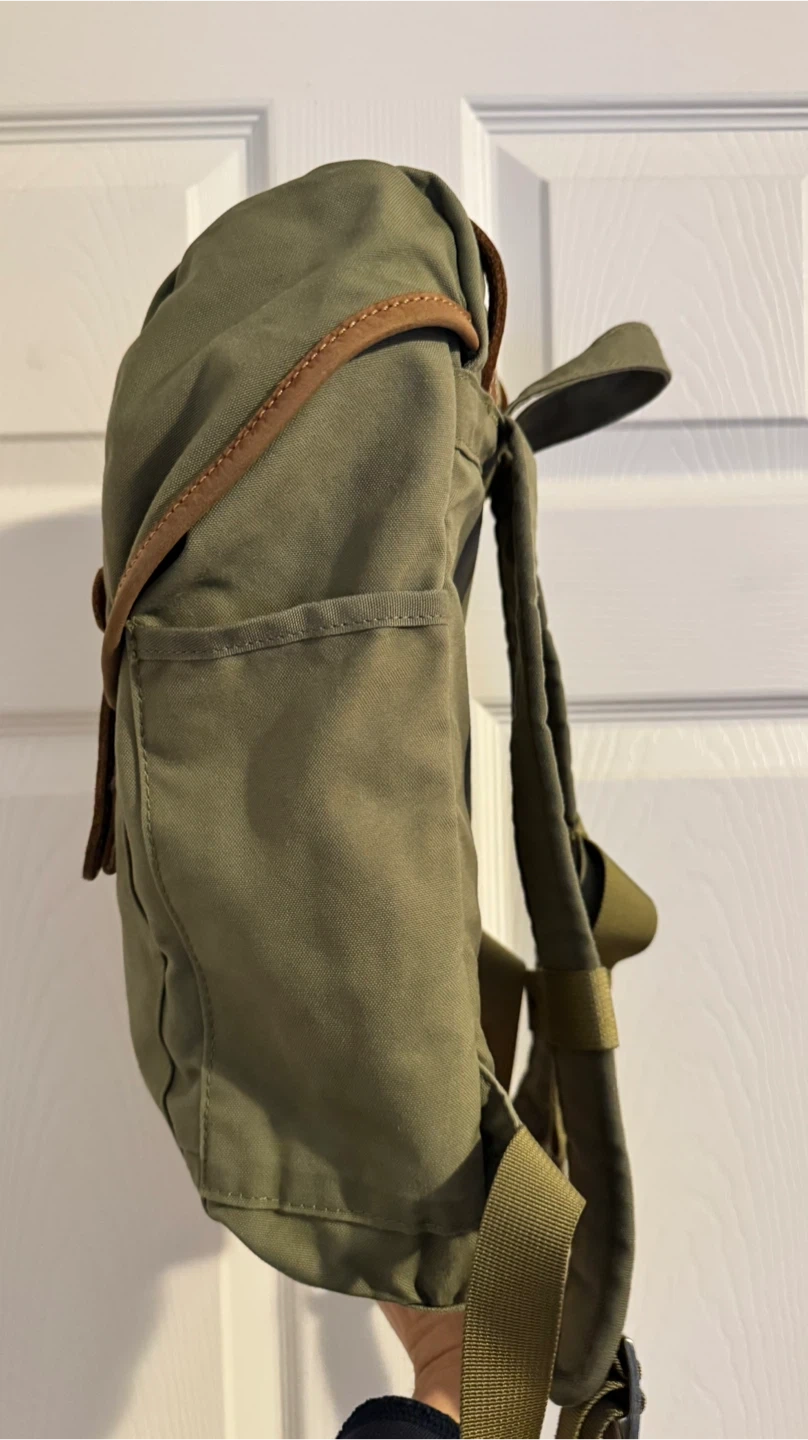 This is a green Fjällräven rucksack No.21.backpack mini. It's made from durable G-1000 HeavyDuty Eco S material with leather details. The dimensions are approximately 14 inches tall and 7 inches wide. This pack is perfect for everyday use or light hiking trips!