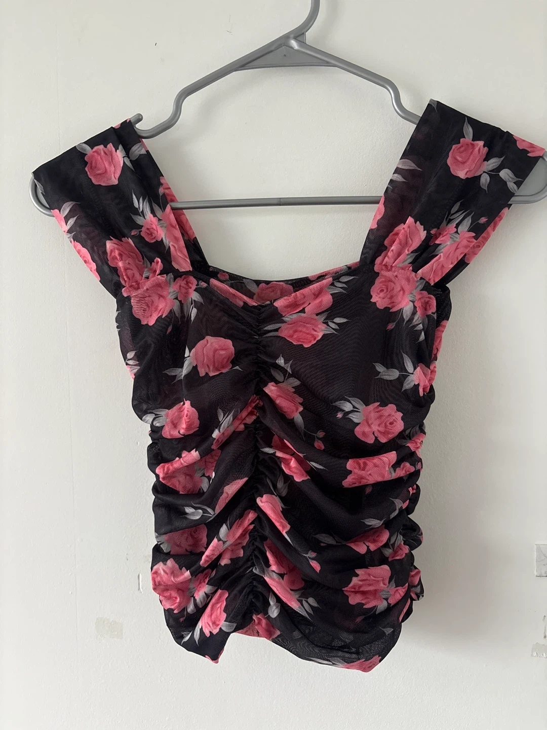 Sheer black mesh top with a pink floral print. Features ruched detailing and a cropped fit. It's lightweight and stretchy.