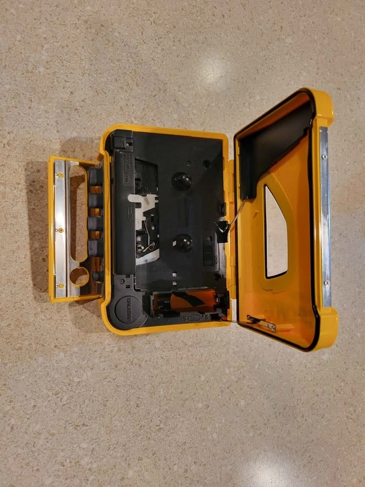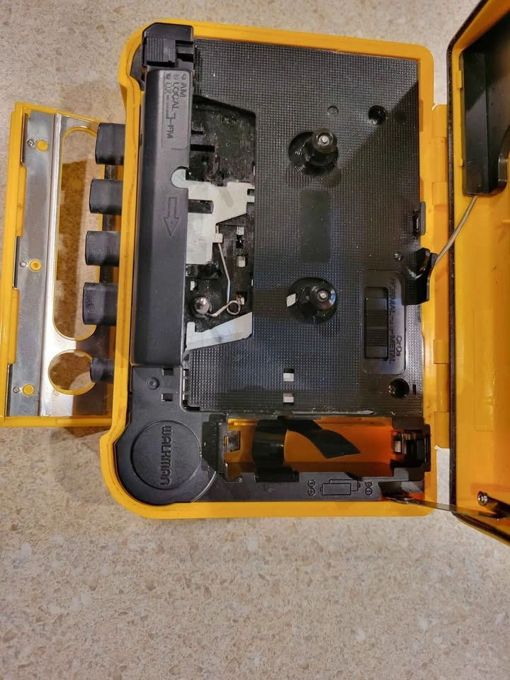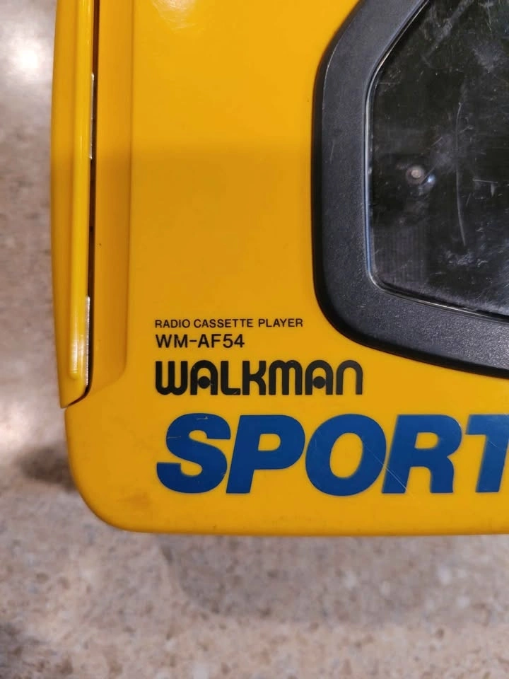 Sony WM-AF54 Sports Walkman, a portable radio cassette player. This vintage model, first released in 1989, is part of the durable Walkman Sports line. Please note: earphones are not included, and the radio turning dial, radio station face plate, and battery cover are missing. The Walkman is in working condition, and I will include brand new batteries.