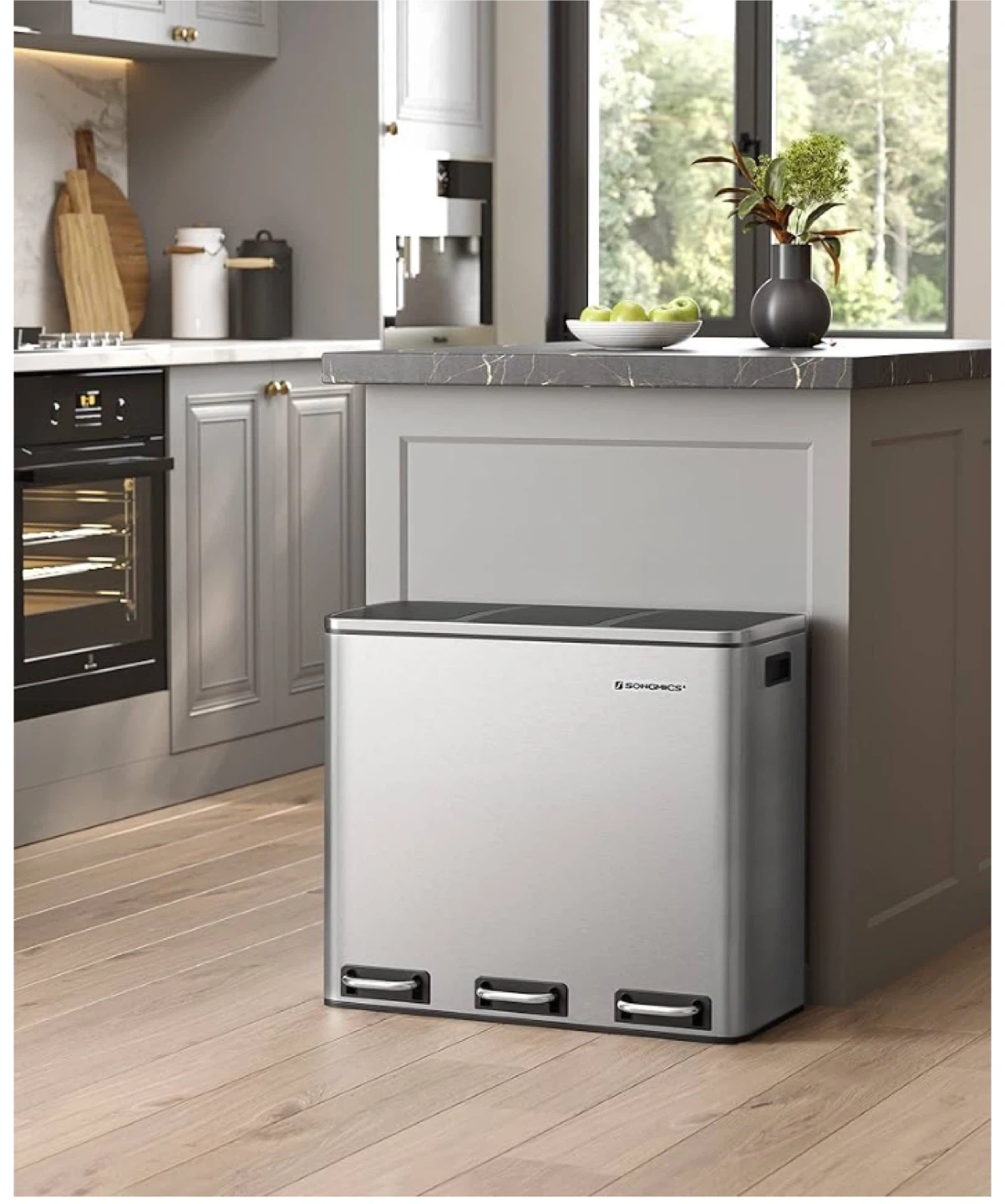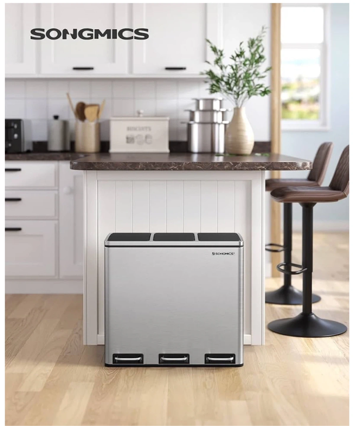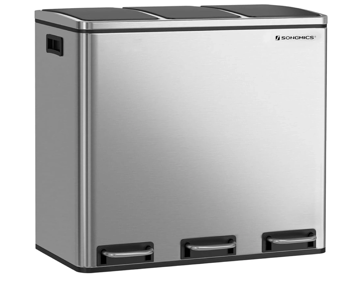 This recycling bin has three separate compartments, perfect for sorting your waste efficiently. Each compartment holds 4.8 gallons. It's made of durable stainless steel and features individual foot pedals for easy access. This bin helps you keep your space tidy and organized!