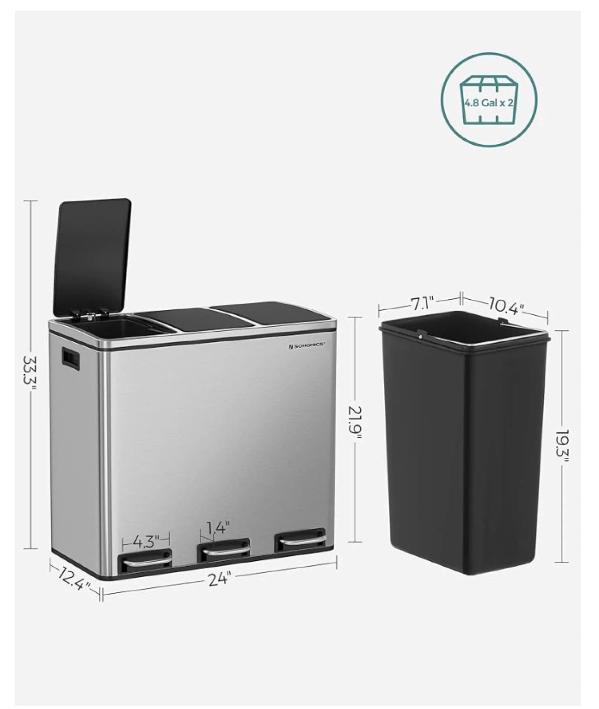 This recycling bin has three separate compartments, perfect for sorting your waste efficiently. Each compartment holds 4.8 gallons. It's made of durable stainless steel and features individual foot pedals for easy access. This bin helps you keep your space tidy and organized!