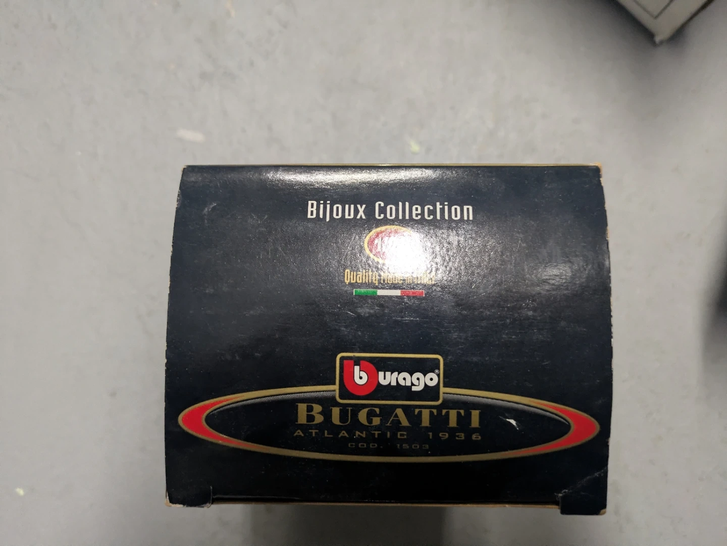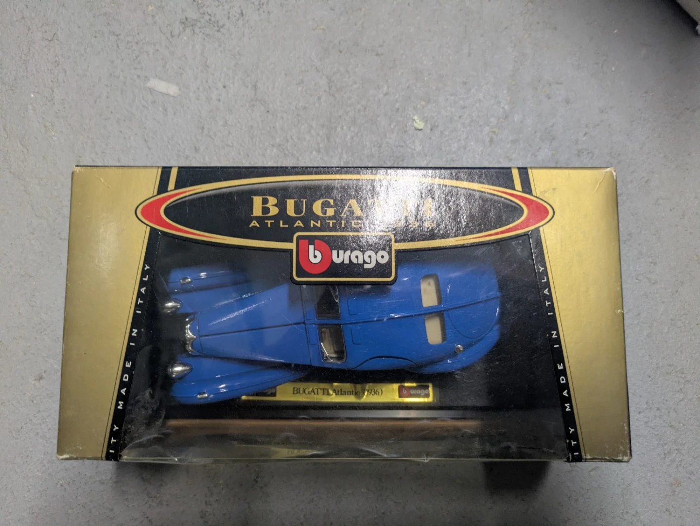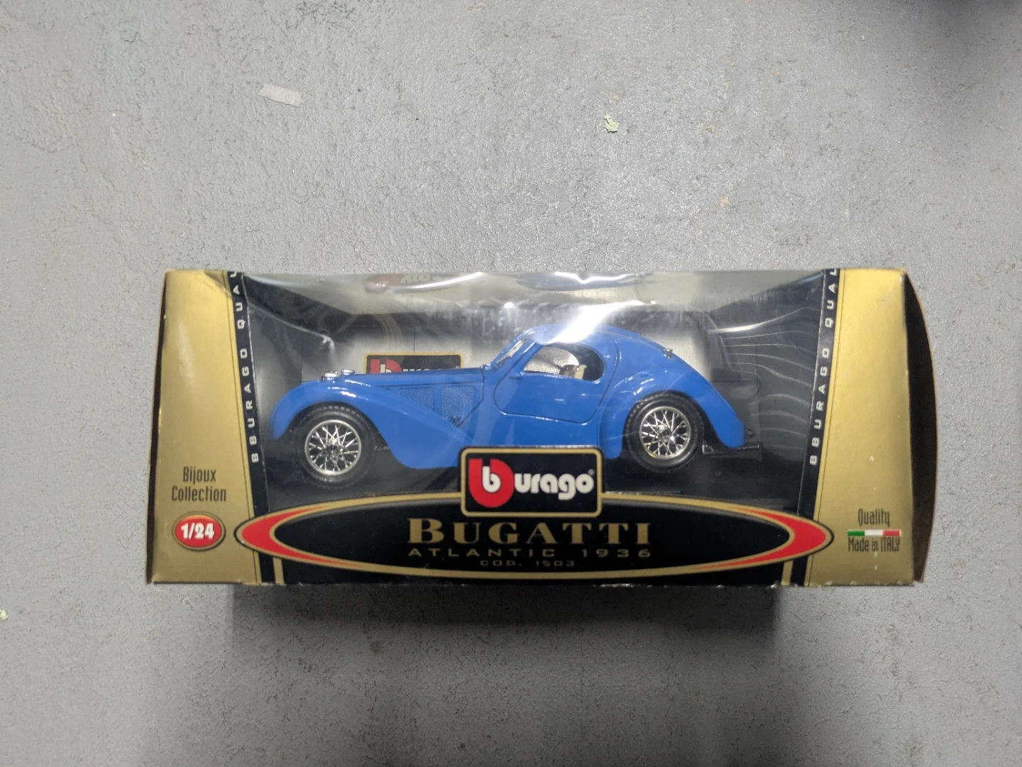 This is a blue Burago diecast model of a Bugatti Atlantic 1936. It's a 1/24 scale model from the "Bijoux Collection". Quality made in Italy.