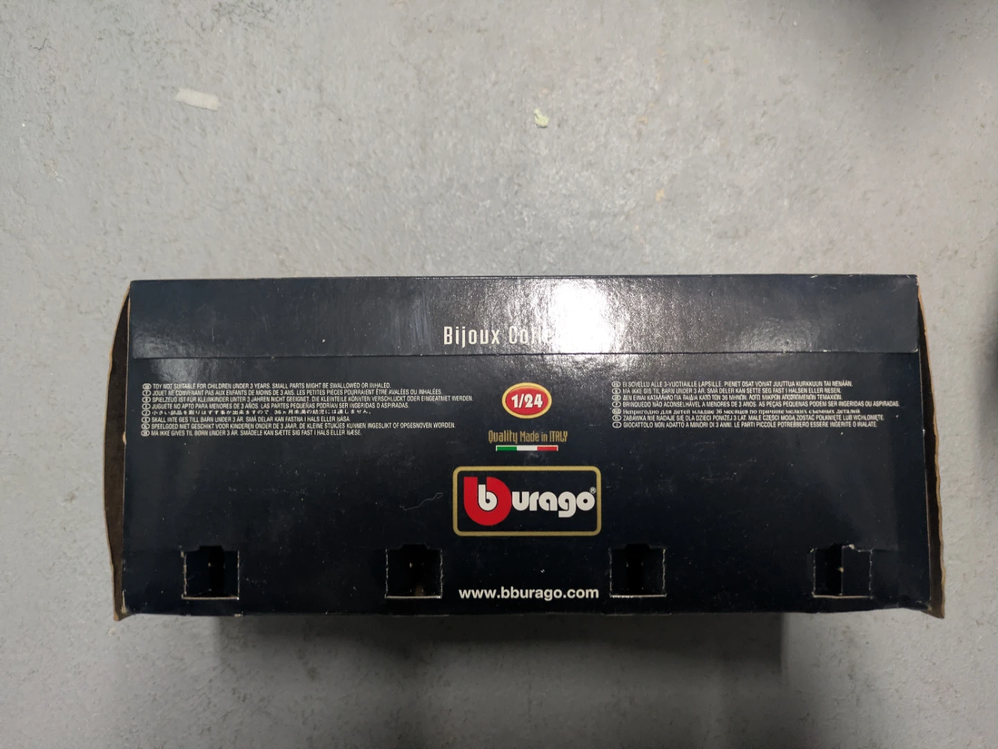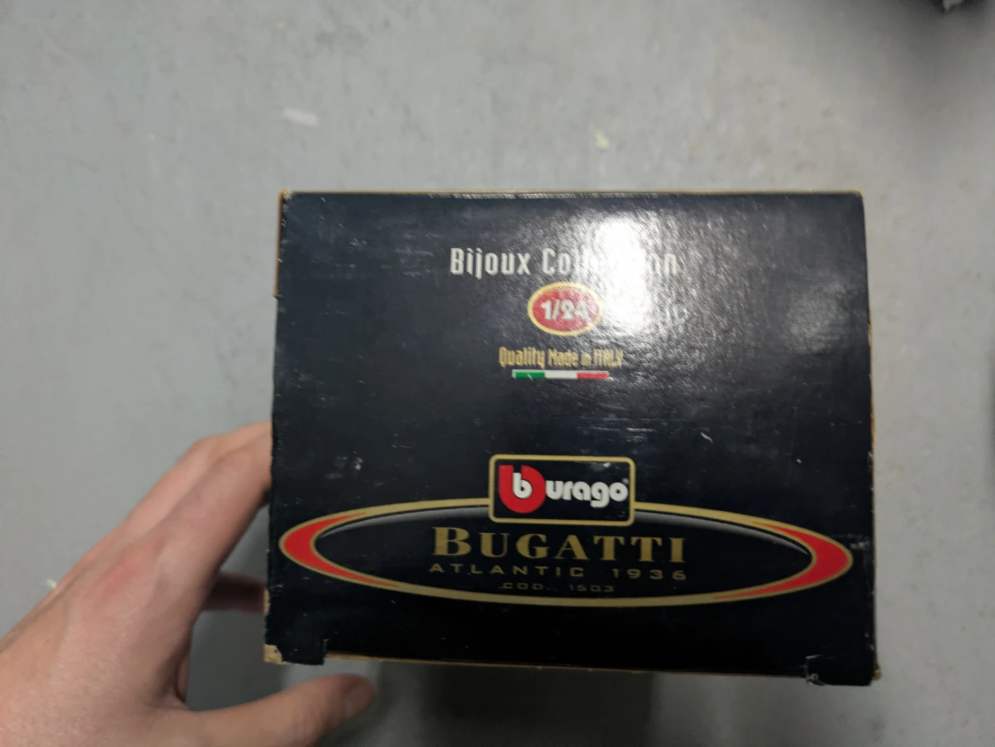 This is a blue Burago diecast model of a Bugatti Atlantic 1936. It's a 1/24 scale model from the "Bijoux Collection". Quality made in Italy.