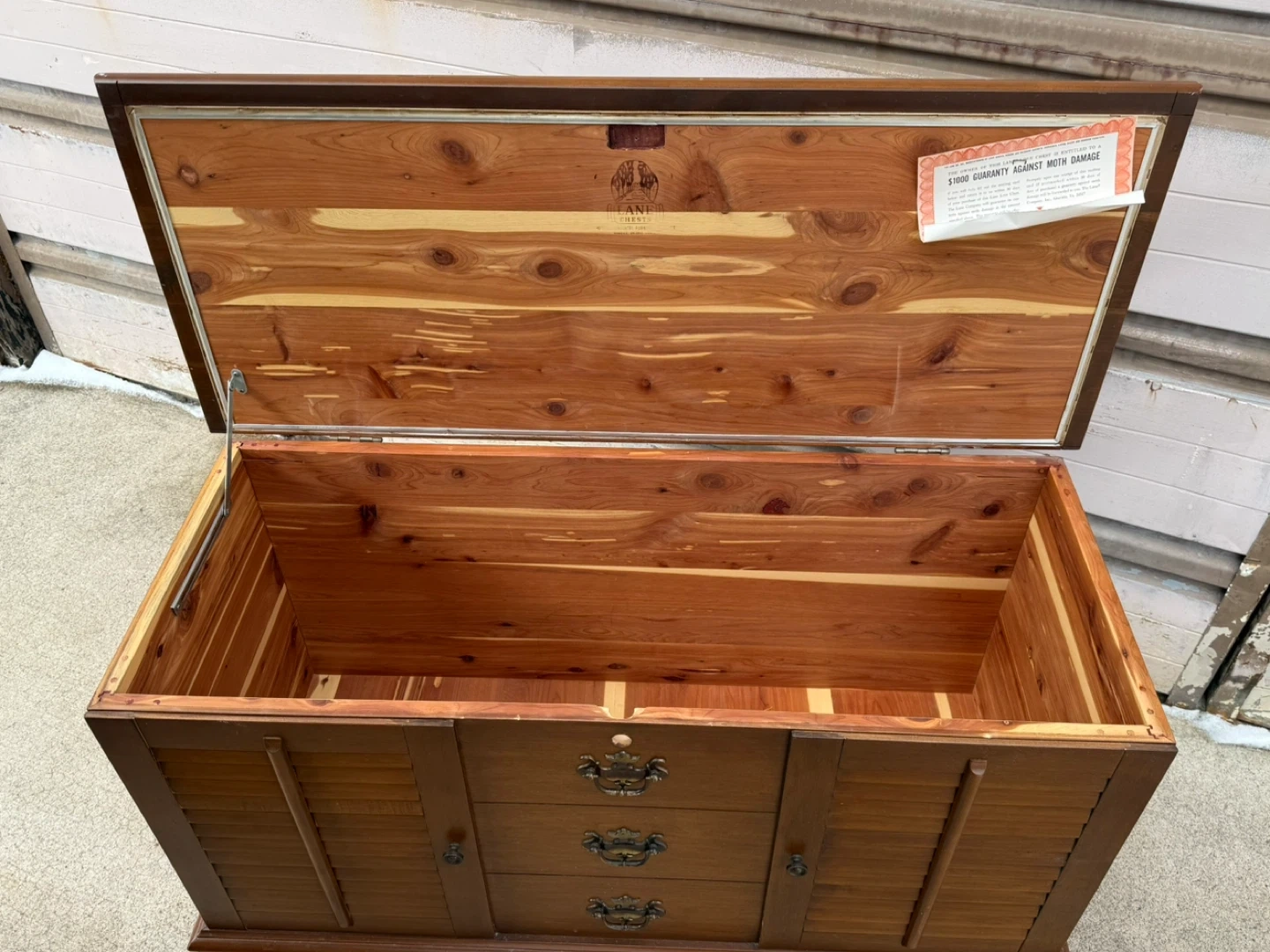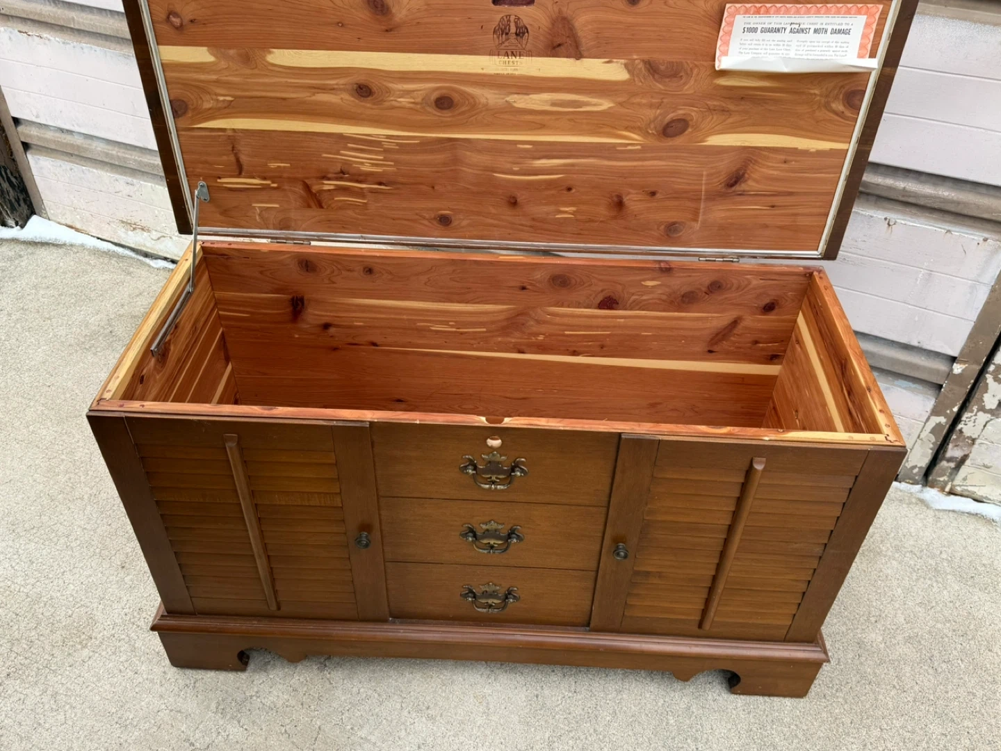 Vintage Lane cedar chest with three drawers. Constructed from wood with a natural finish. Features louvered side panels and ornate drawer pulls. Cedar lining helps preserve contents.