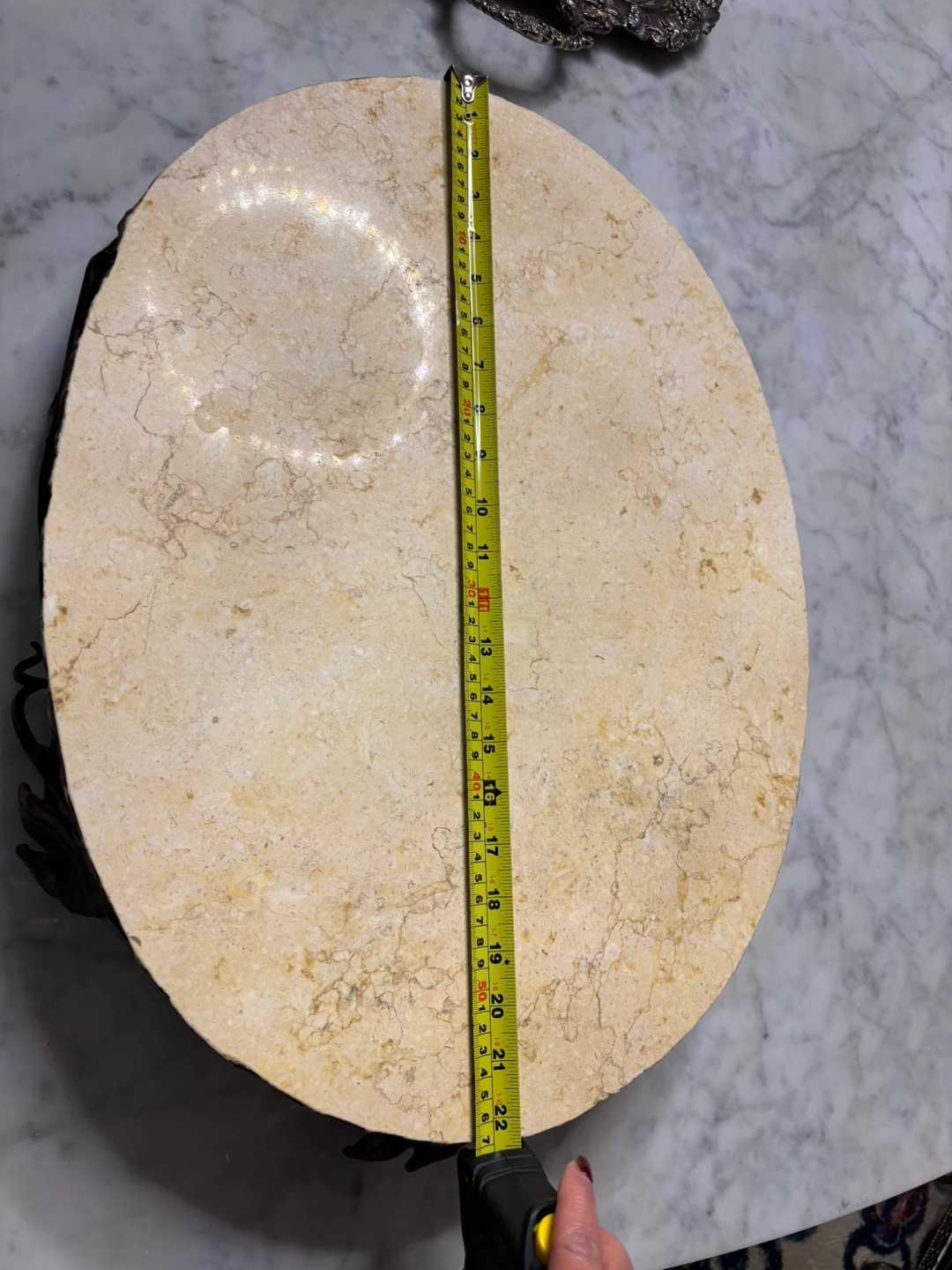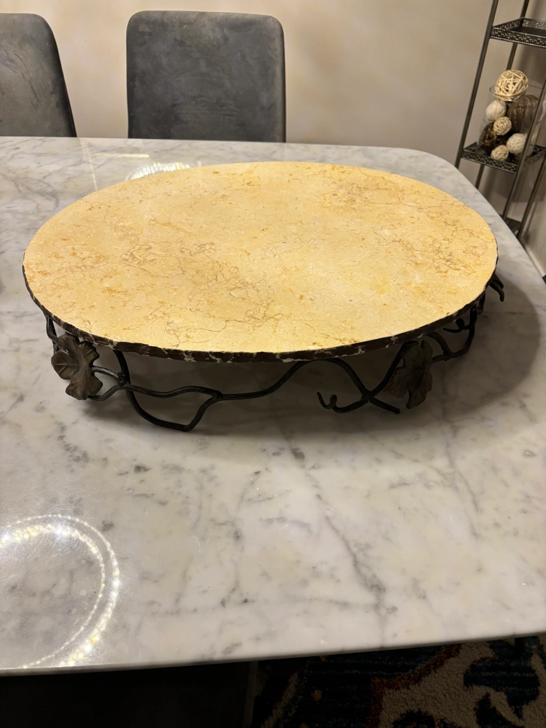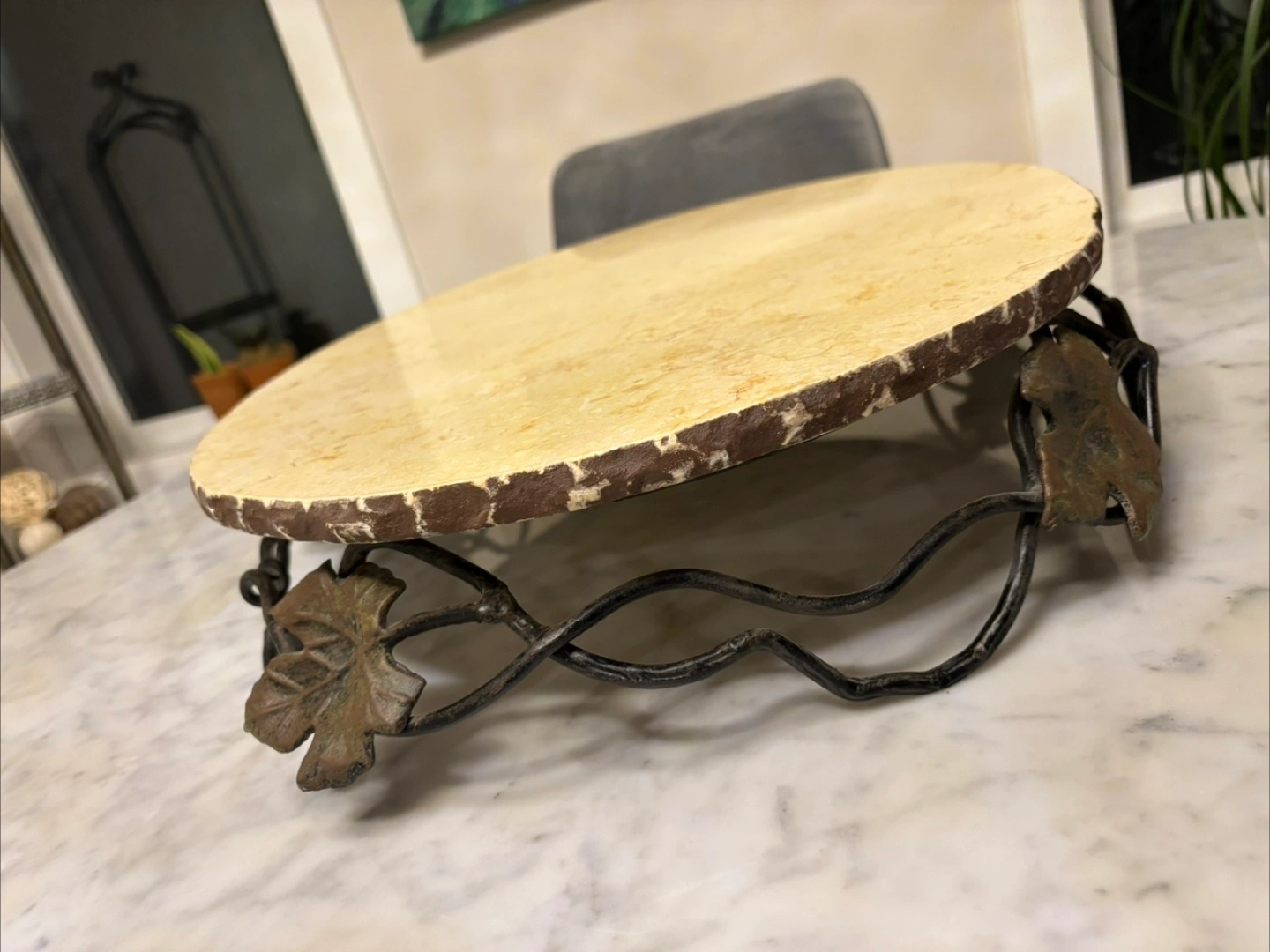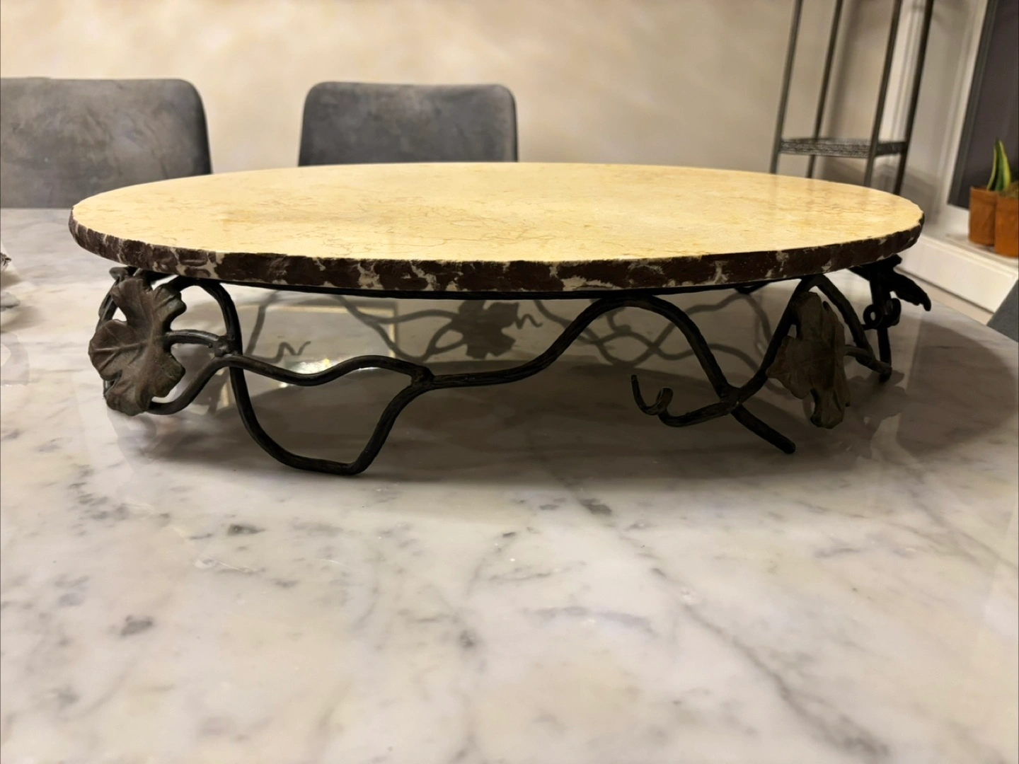 Beautiful oval marble serving tray. Features an ornate metal stand with leaf accents. Approximately 22 inches long. Perfect for parties or everyday use.