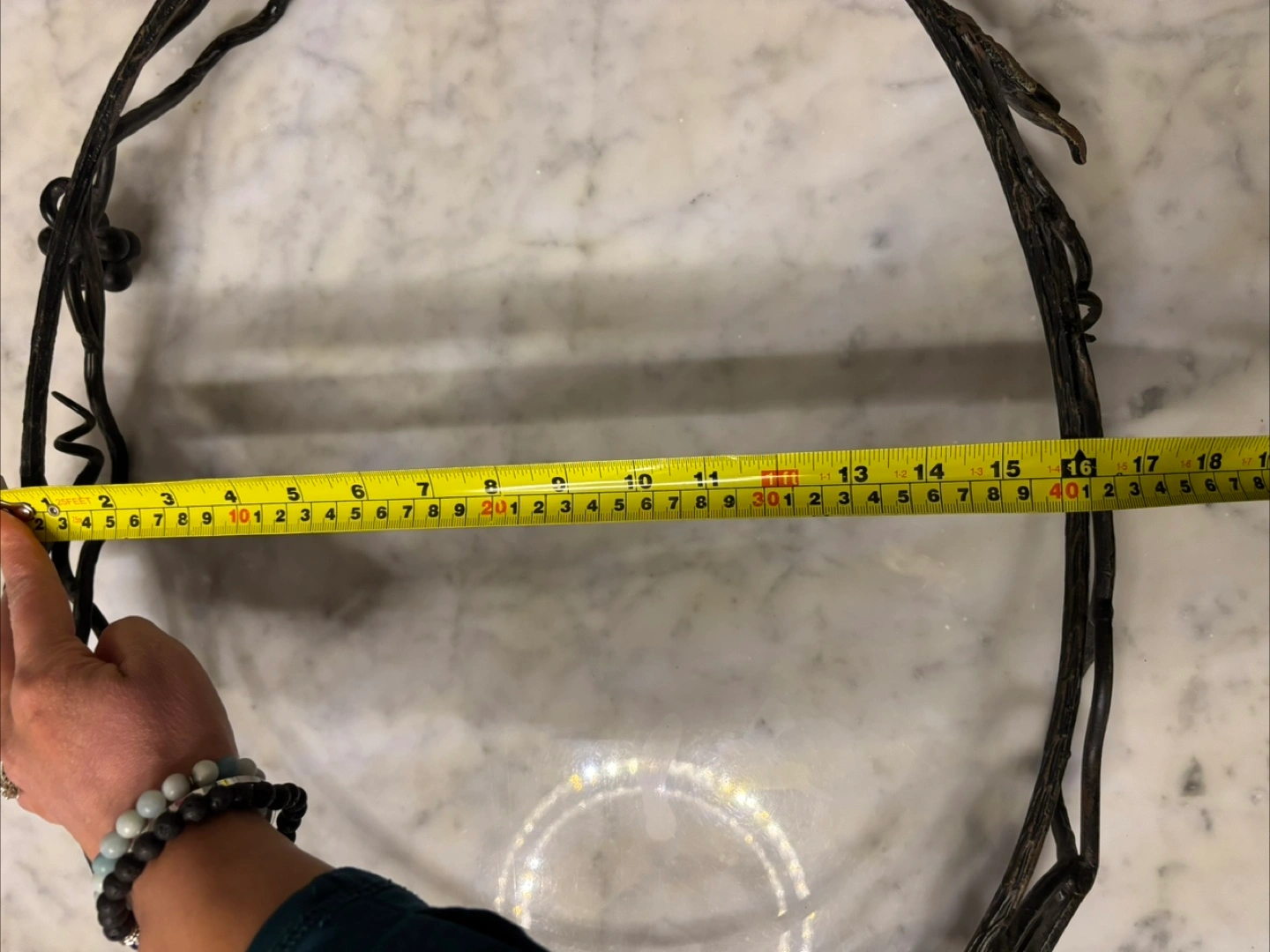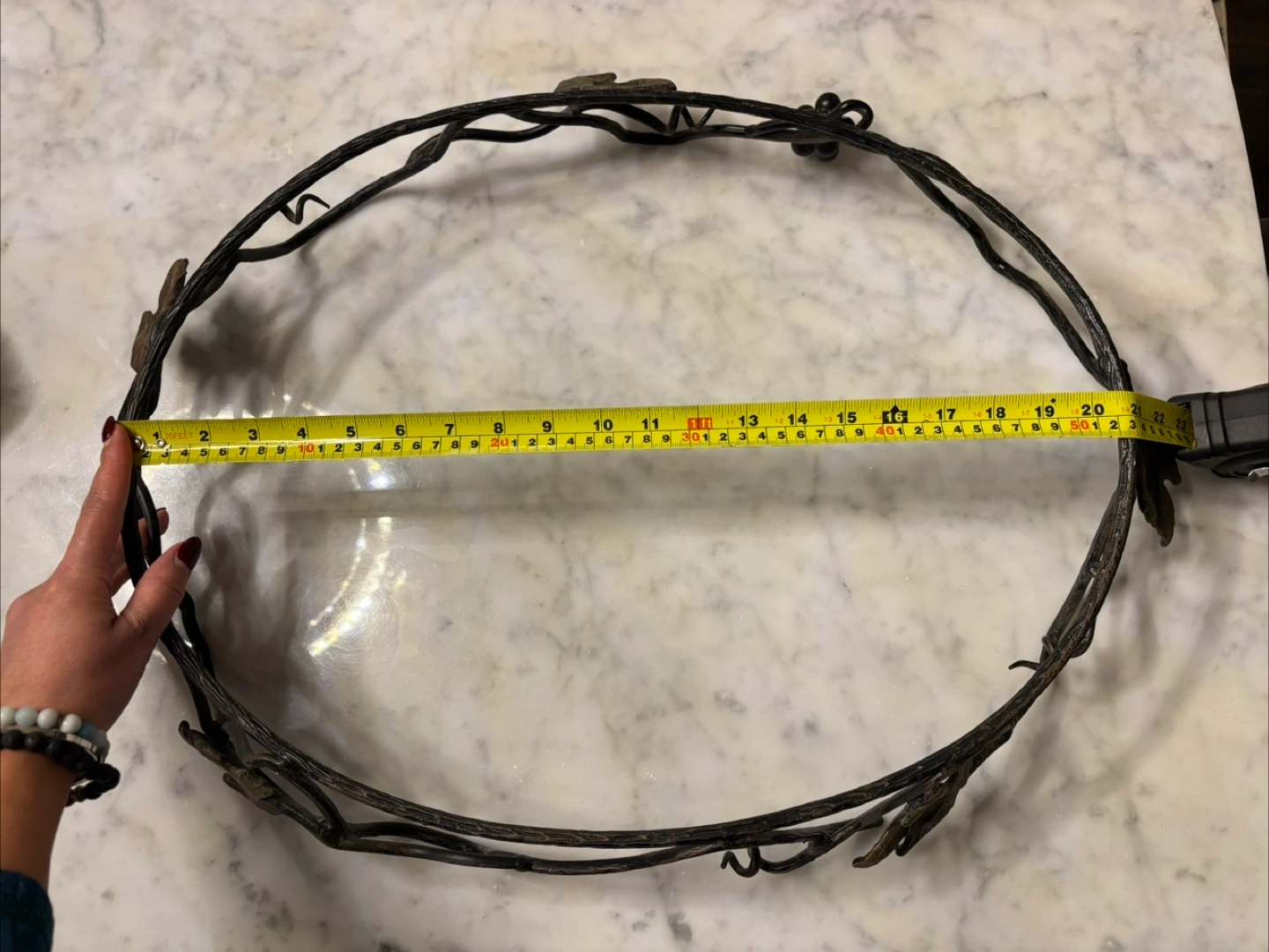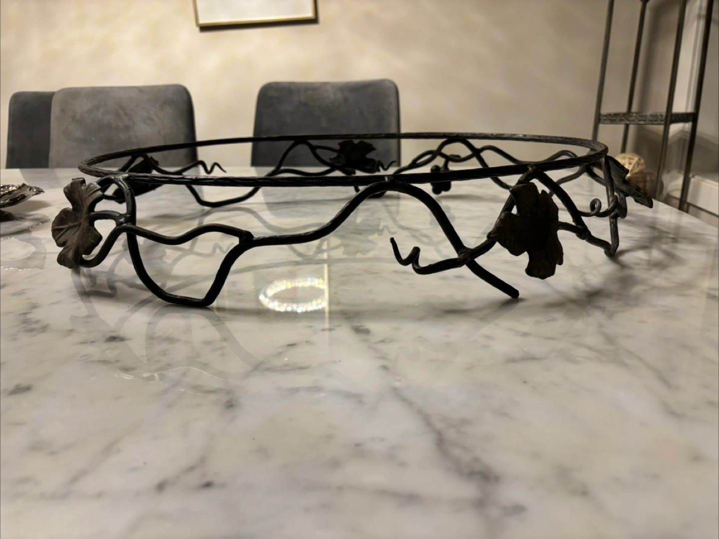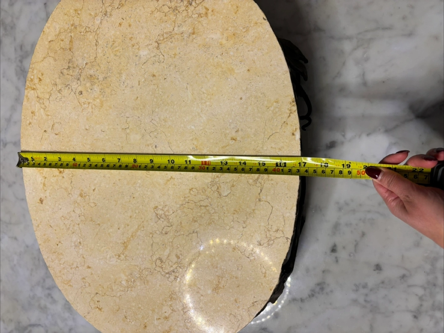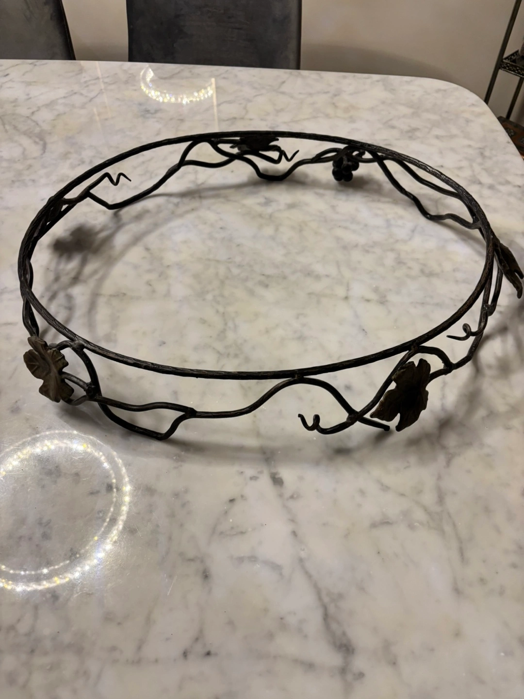 Beautiful oval marble serving tray. Features an ornate metal stand with leaf accents. Approximately 22 inches long. Perfect for parties or everyday use.