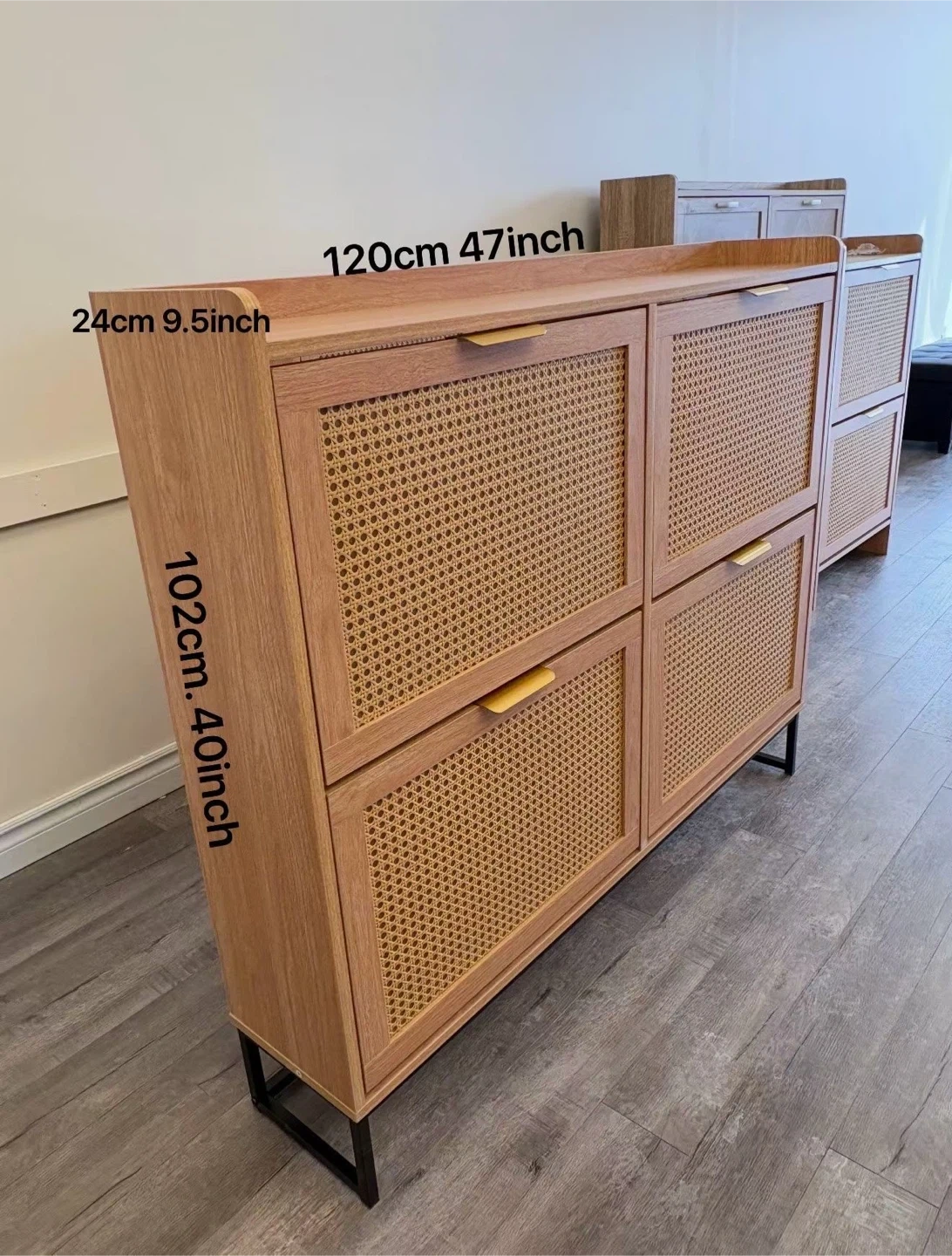 This shoe cabinet is made of wood and features a natural wood finish with cane accent doors. It measures 120cm (47 inches) in width, 102cm (40 inches) in height, and 24cm (9.5 inches) in depth. It has multiple shelves for shoe storage. This cabinet would be useful for organizing footwear in an entryway or closet.