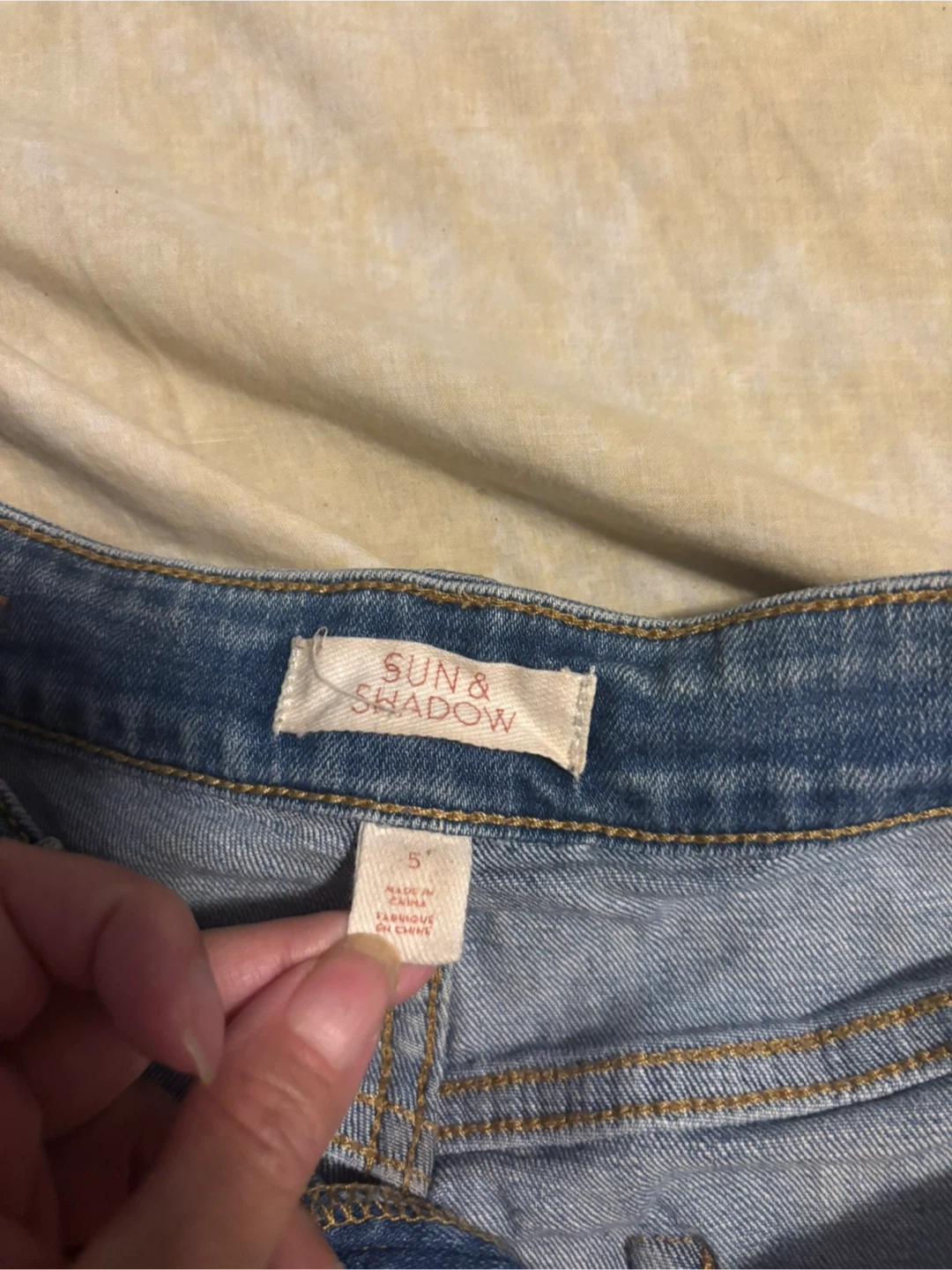 These are Sun & Shadow denim cutoff shorts. They're a size 5. Made from a soft denim material.