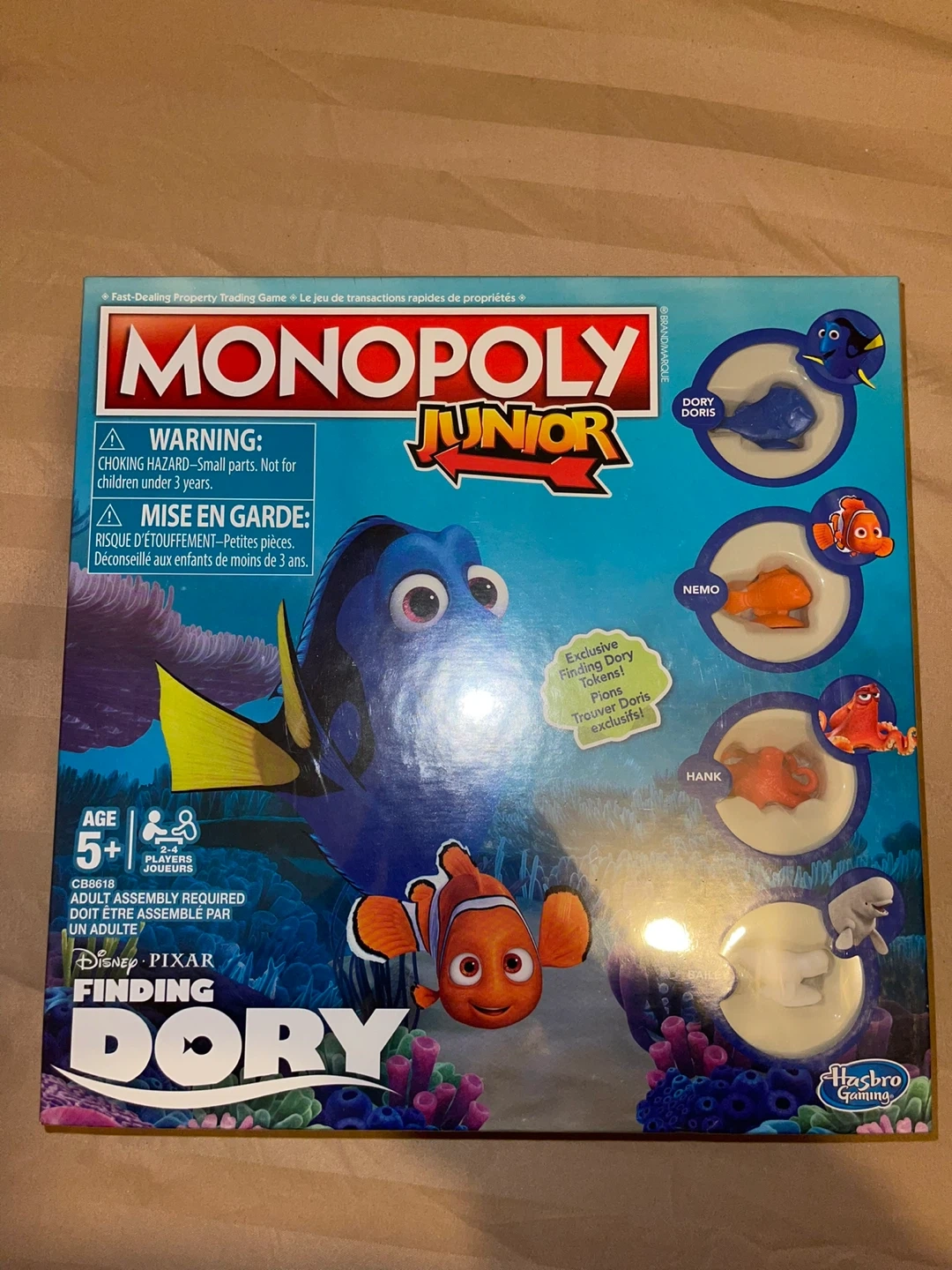 It's Monopoly Junior featuring characters from Disney Pixar's Finding Dory! This game includes exclusive Finding Dory tokens. Recommended for ages 5 and up, it's for 2-4 players. Adult assembly is required.
